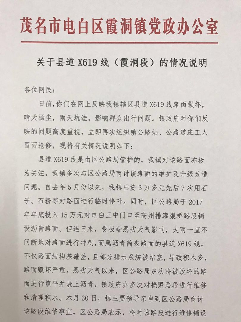 日前,你们在网上反映我镇辖区县道X619线路面损坏,晴天扬尘,雨天坑洼,影响群众出行问题。镇政府对你们反映的问题高度重视,立即再次组织镇公路站、公路道班工人冒雨抢修,现将有关情况说明如下: