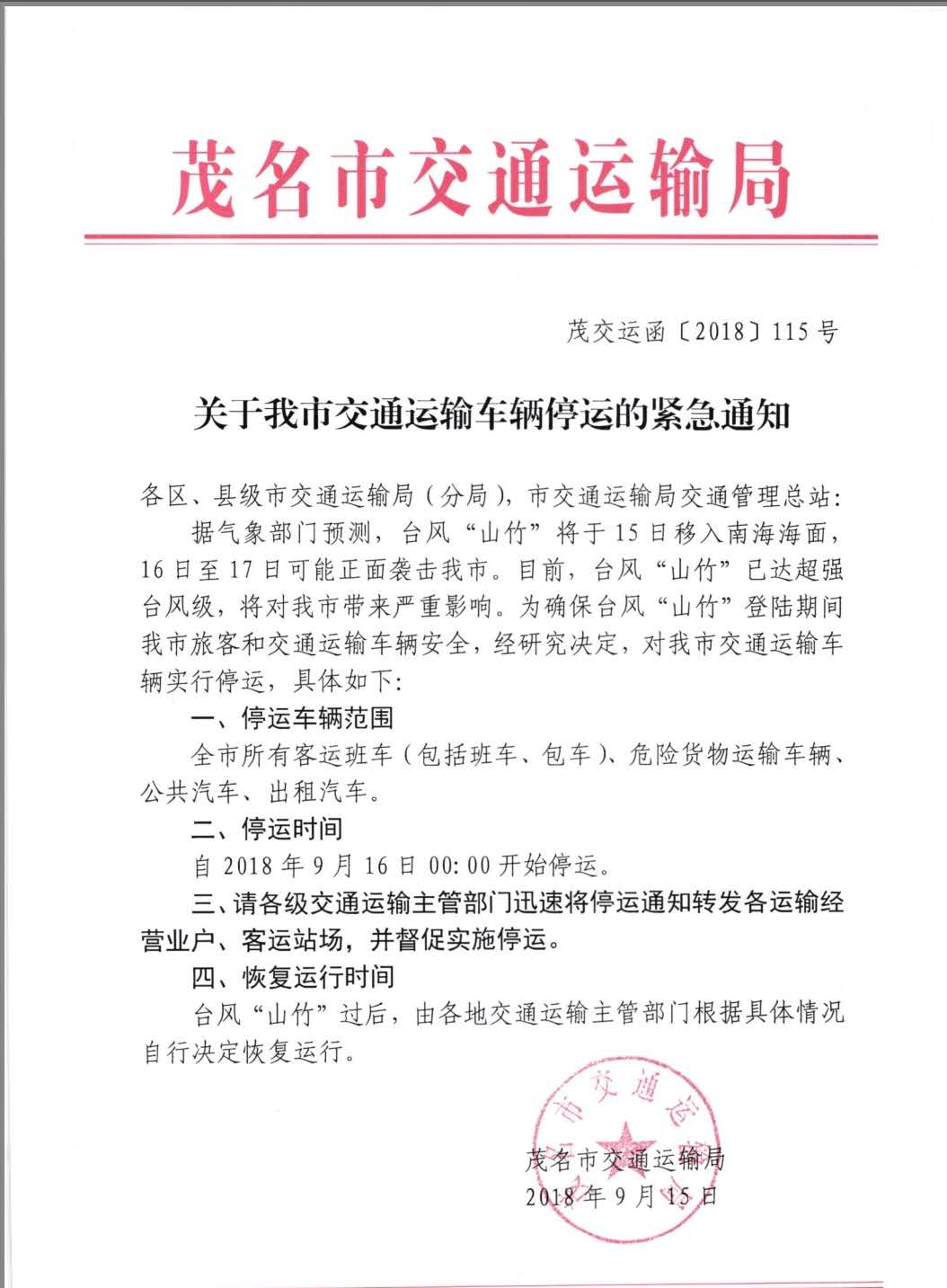 茂 茂名市电白区岳云粤运汽车运输有限公司 幼儿园 注册 2018-09-15 消息 1 反馈评分 0 点数 0 年龄 35 性别 男 2018-09-15 #1 尊敬各位市民、乘客 为确保台风“竹山”登陆期间旅客和车辆的安全,接上级主管部门的紧急通知,我司车辆将于2018年9月16日00:00起开始停运。 茂名市电白区粤运汽车运输有限公司 2018年9月15日 附件 1111.jpg 89.4 KB · 查看: 387