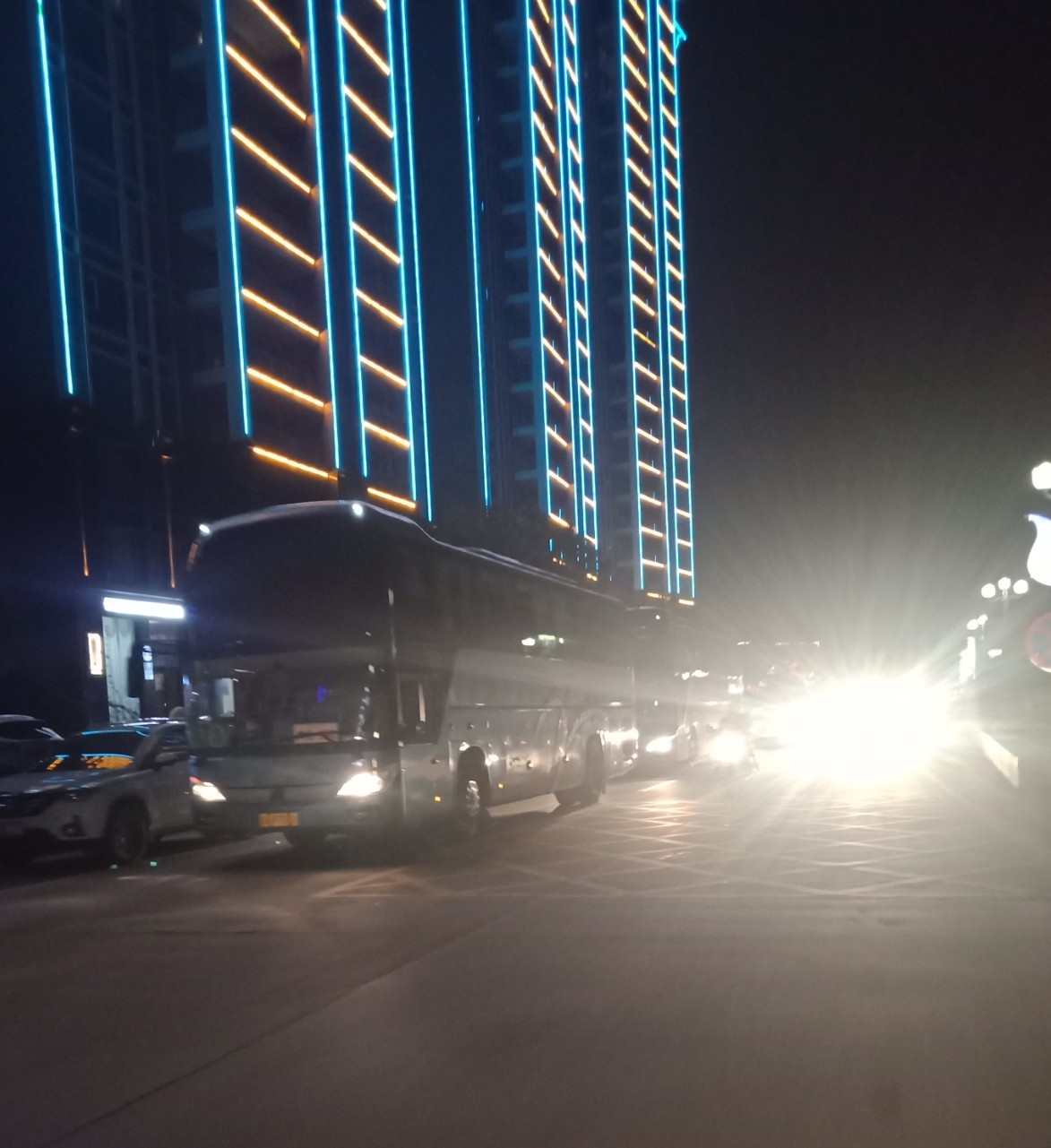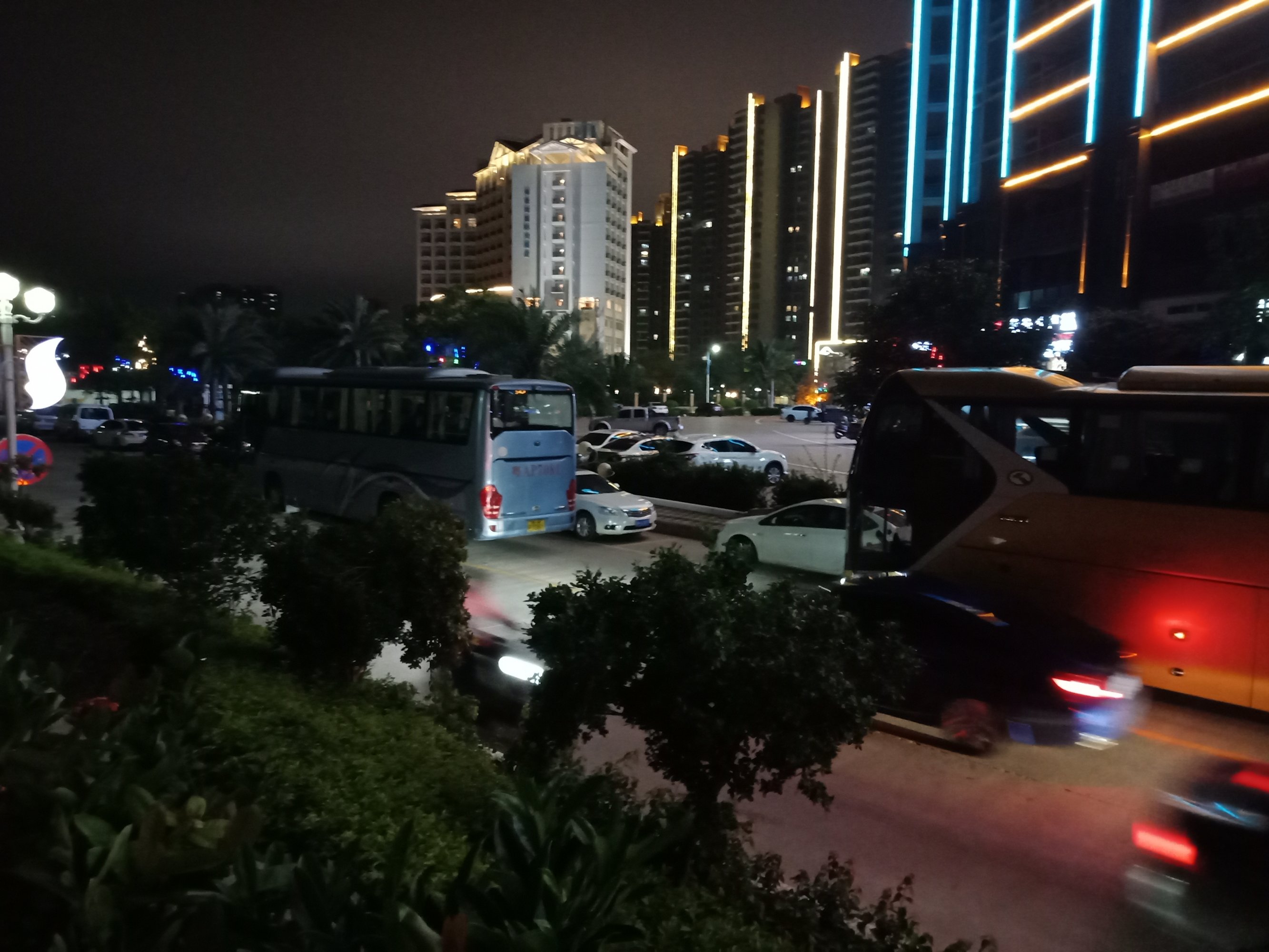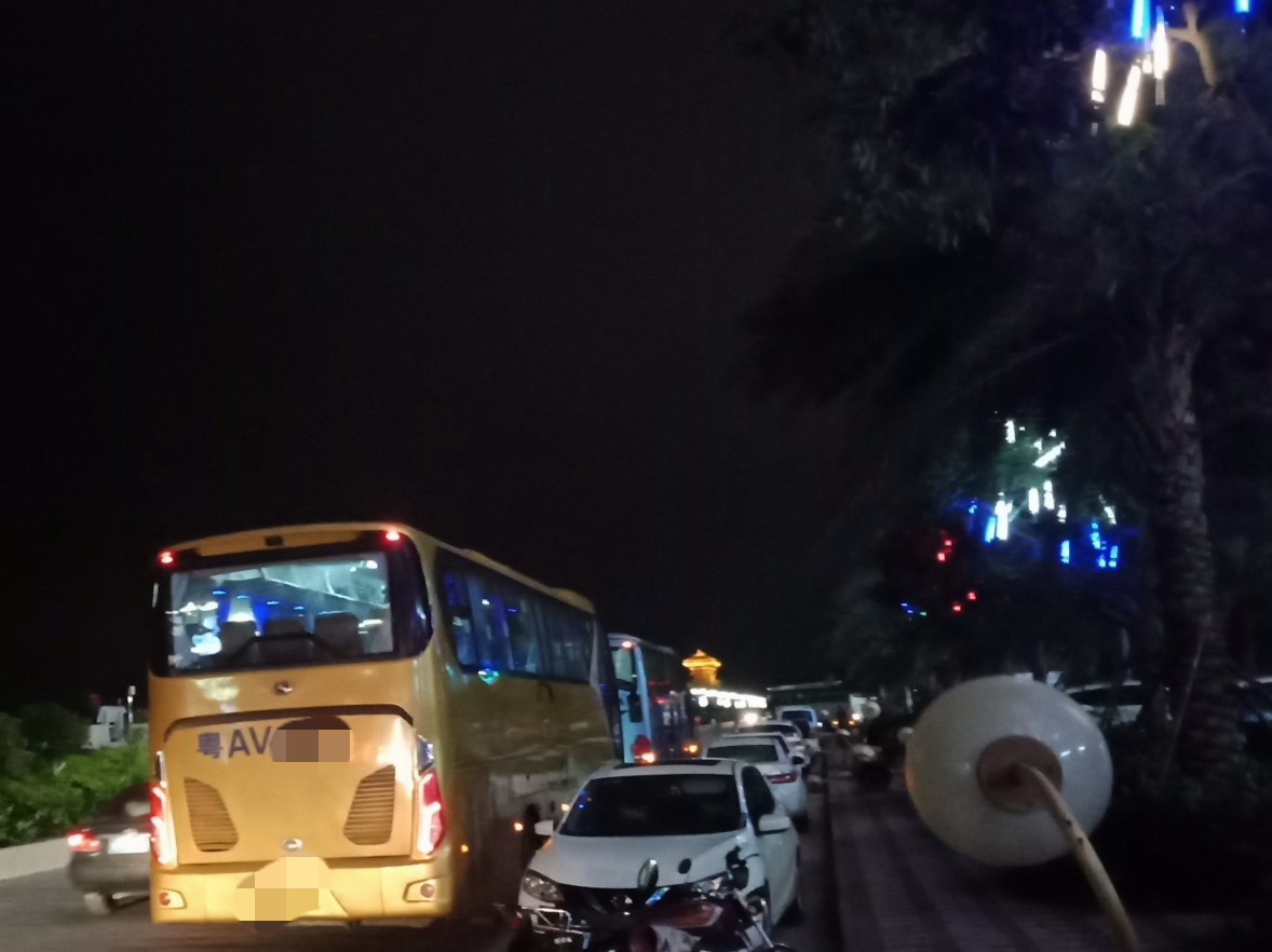 今晚星期五7点几钟,又想去东湖吸吸7点半钟的光影秀(还有场8点半的.还有明晚星期六的两场),驾摩出时有微微雾雨,人群虽少许多(可能是有雾雨吧?),但徒步群众都有好些(有些拿了雨伞),见还没开始,就驾摩过栈道那边吸吸,忽见有几辆游巴从海滨大桥那边方向开来,并停靠在亲水平台这边停下,并从游巴上走下尊贵的远方游客~