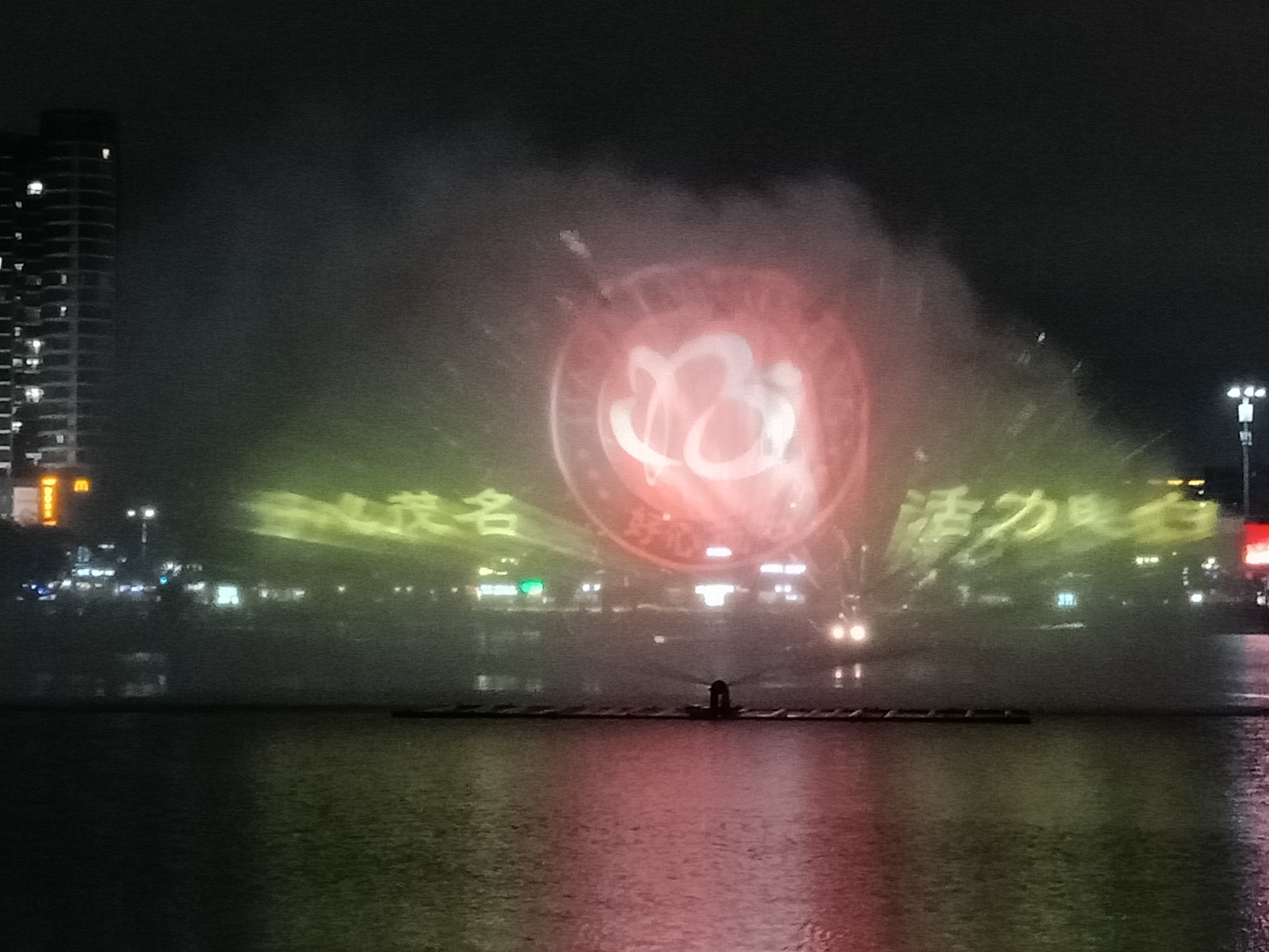 在这说下,貌似有些情节与先前的有点变化出入与改进了些,虽湖堤边有好些人围着,但相对节前,人没那么多了,但人群也还可以,(或天气等问题?),选择站的位置也好许多,况且看那水雾投像也清晰明亮~许多,不过风有点大吹得水雾有点散偏斜等,不过现场看了算行,但瓦手机拍得不行~这以上只是个人见解所观,或瓦感观观赏力不行吧,亲临其景的现场观众群众说好才是好吧?