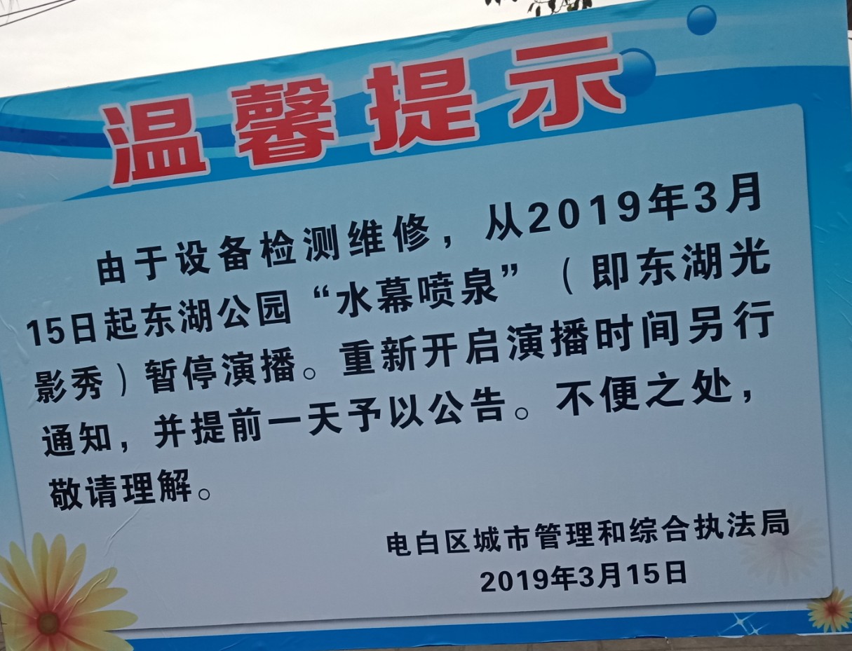 温馨提示:东湖公园水幕喷泉.光影秀,检测维修暂停演播~
