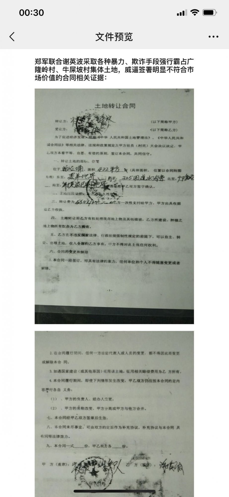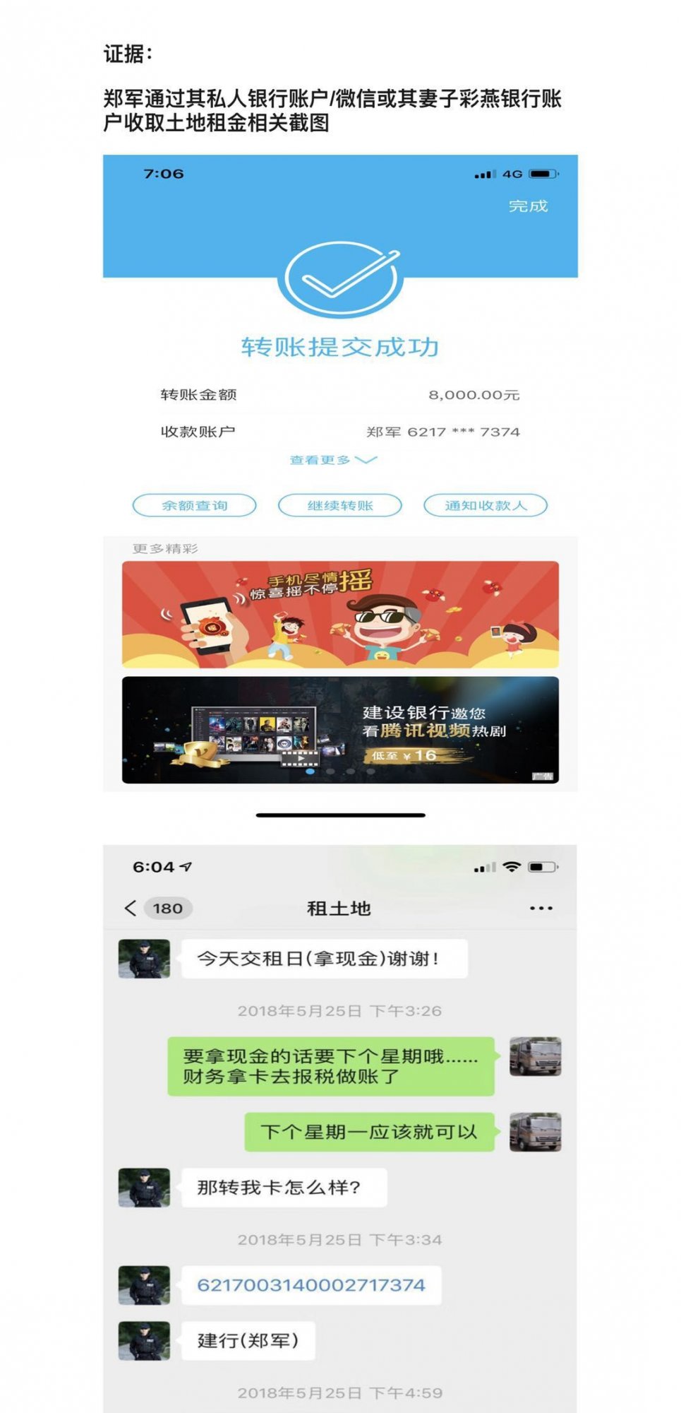 2、 违法霸占村民集体土地,私自收租:郑军在2014年联合谢英达(金刚)胞弟谢英波采取各种暴力、欺诈手段强行霸占广隆岭村、牛屎坡村集体土地用于出租给茂名市鼎兴汽车贸易有限公司,月租金8000元。鼎兴汽车法人代表李良已亲口承认该租金每月由郑军本人收取,有相关微信截图、语音作为证据。李良手机号码:18576270983。谢英波妻子也承认,在其丈夫被拘留阶段,该土地的租赁事宜全权由郑军在负责操作。谢英波妻子手机号码为:15999902286。