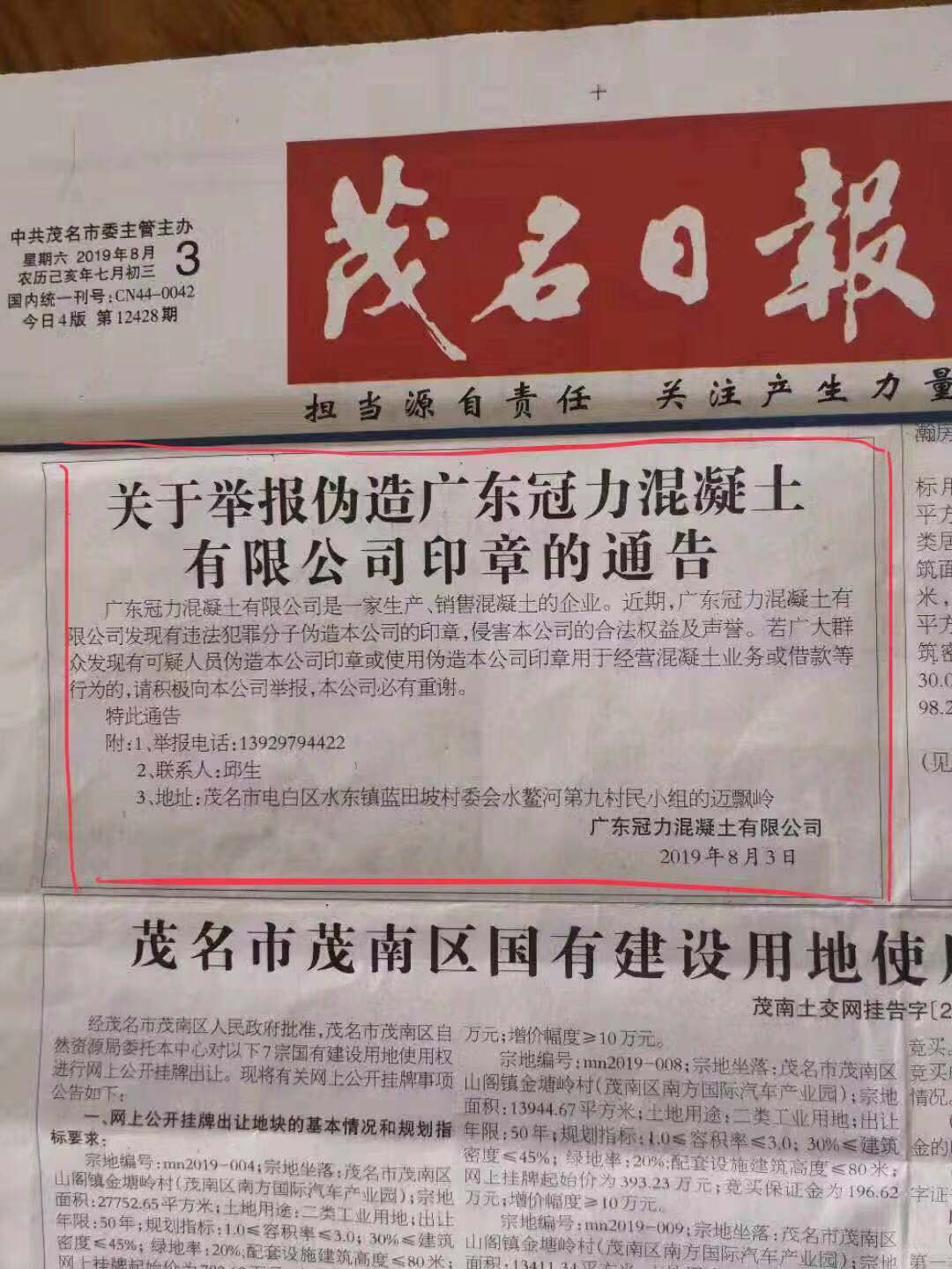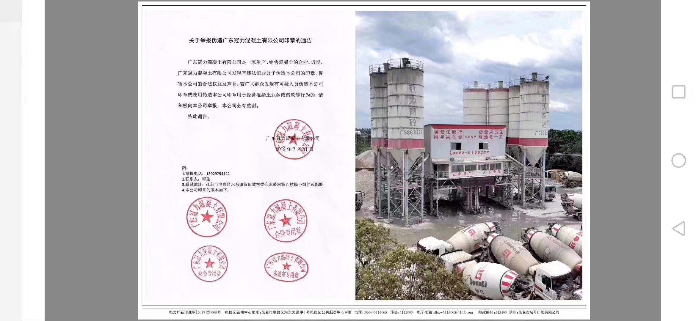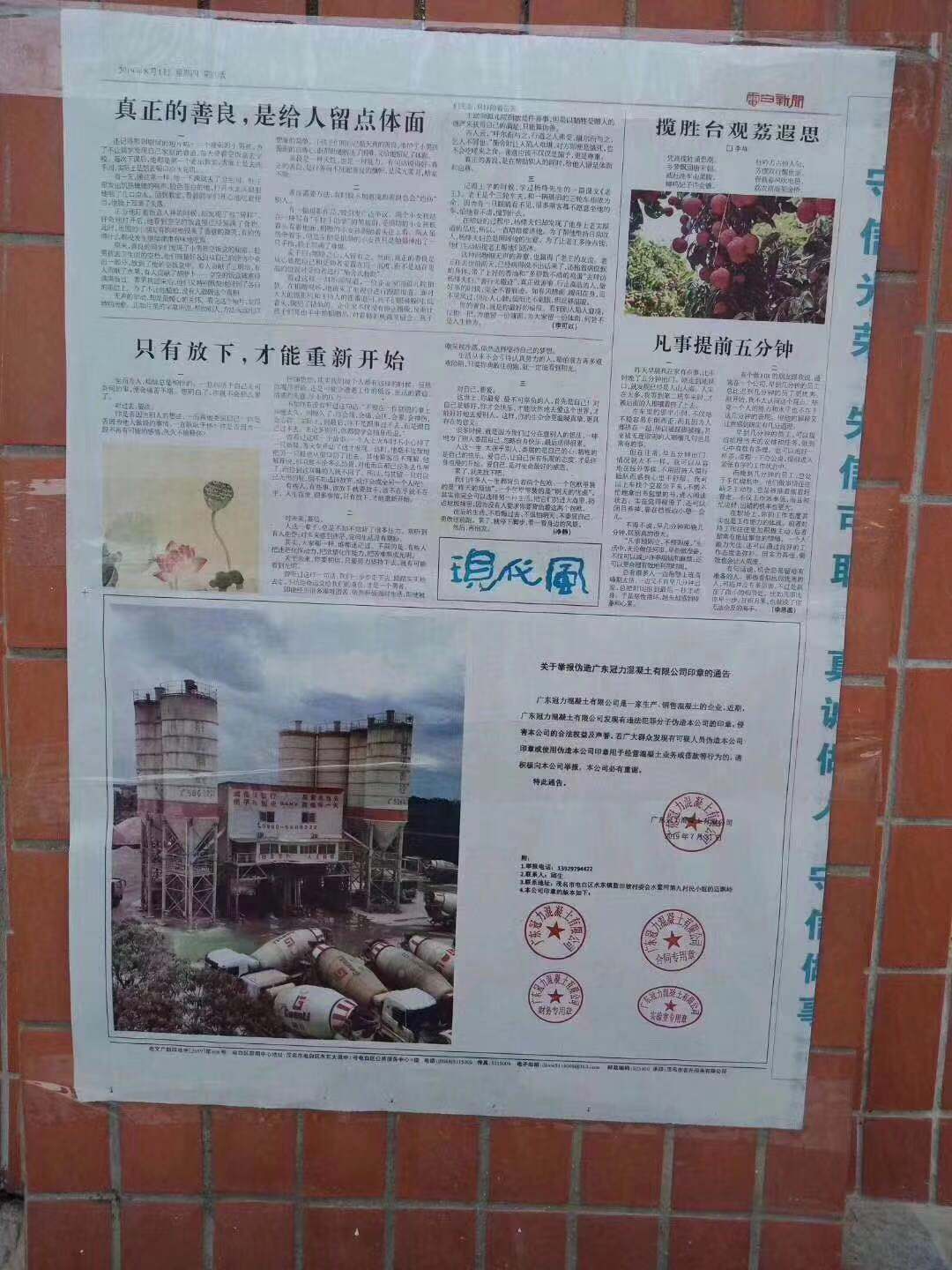 广大群众发现有可疑人员伪造广东冠力混凝土有限公司印章用于经营混凝土业务或借款行为的,请积极向本公司提供线索举报,本公司将重酬举报人并为举报人保密。请知情者行动起来,不要让这些不法份子逍遥法外。