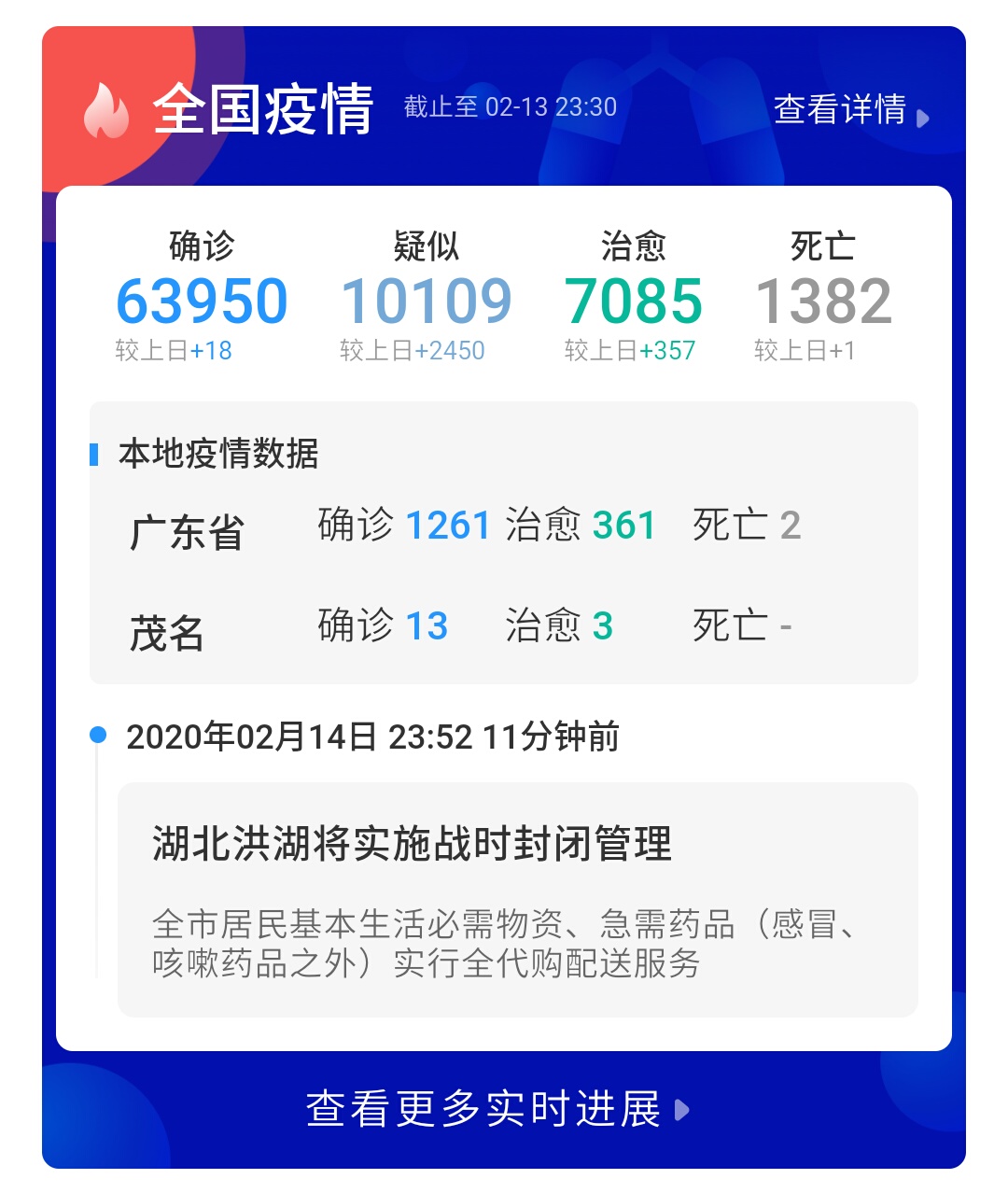 2月17日,广东省卫生健康委确诊茂名新增1例新型冠状病毒肺炎(简称新冠肺炎)病例,目前全市累计14例(3例已治愈)。