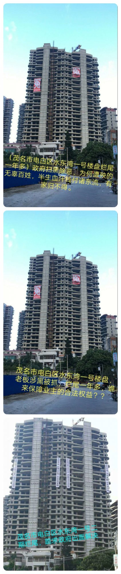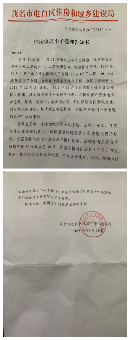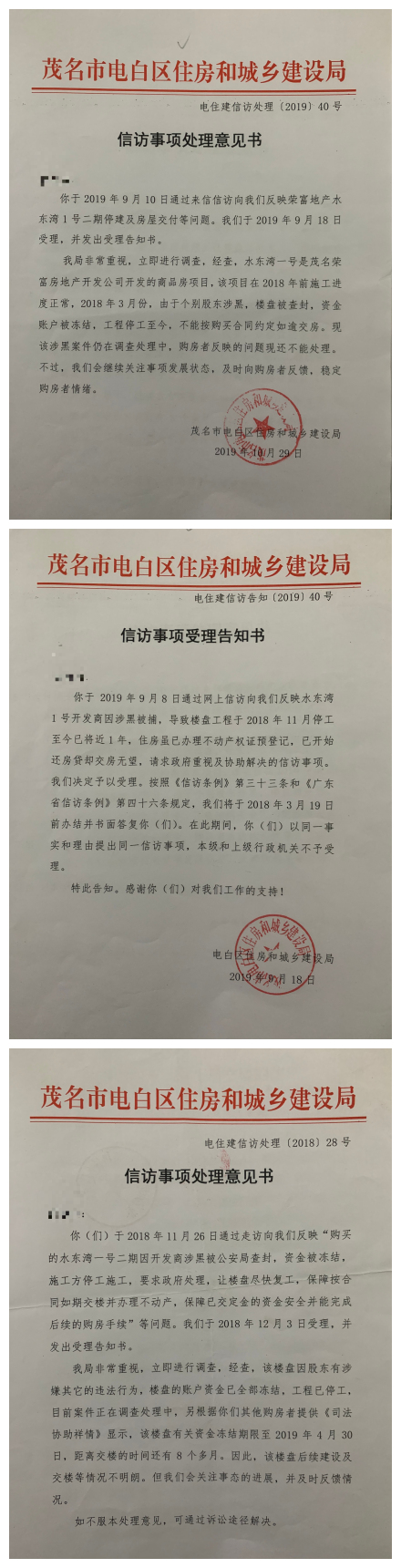 我们业主前后8次去茂名市信访和区信访反映我们业主的诉求,但8次都是不了了之,次次叫我们回去等,一等几年过去了,再等我怕一辈子就过去了。