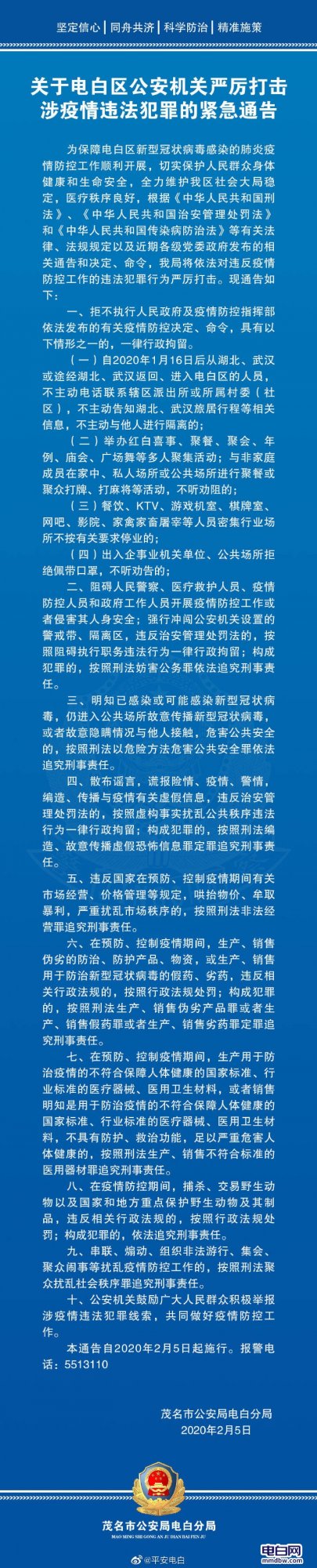关于电白区公安机关严厉打击涉疫情违法犯罪的紧急通告