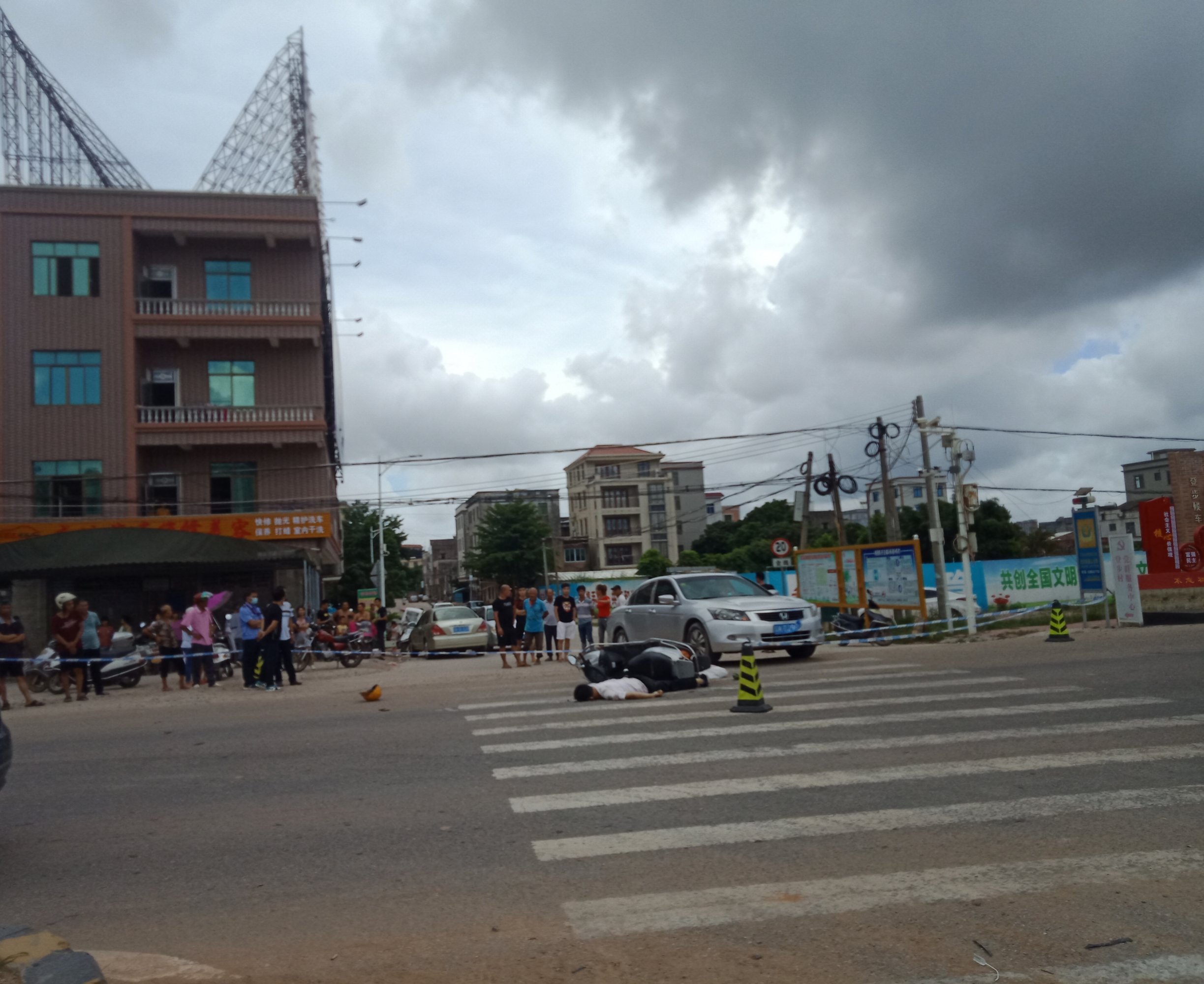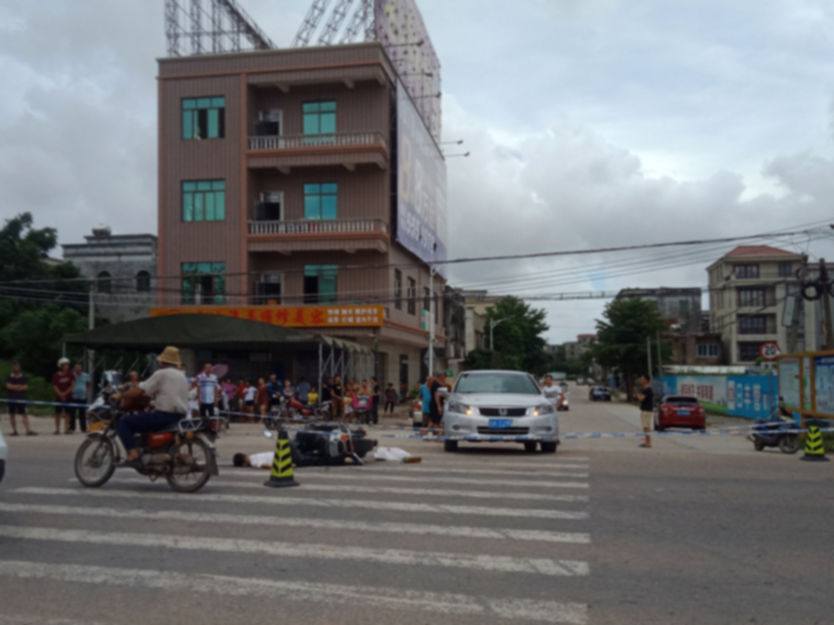 小车出路口碰倒摩托车,摩托车被后面的货车撞上,摩托车司机貌似被碾压了