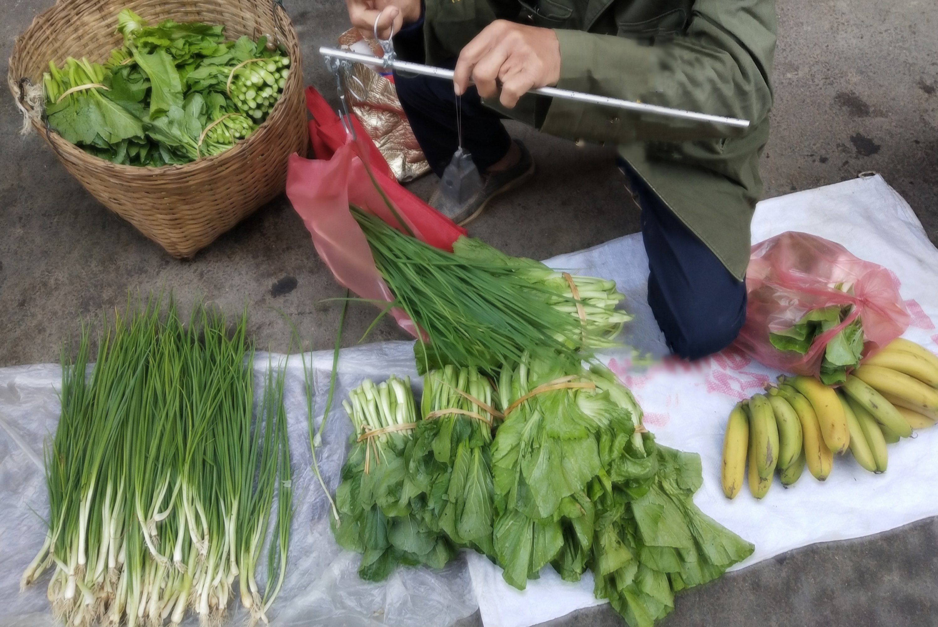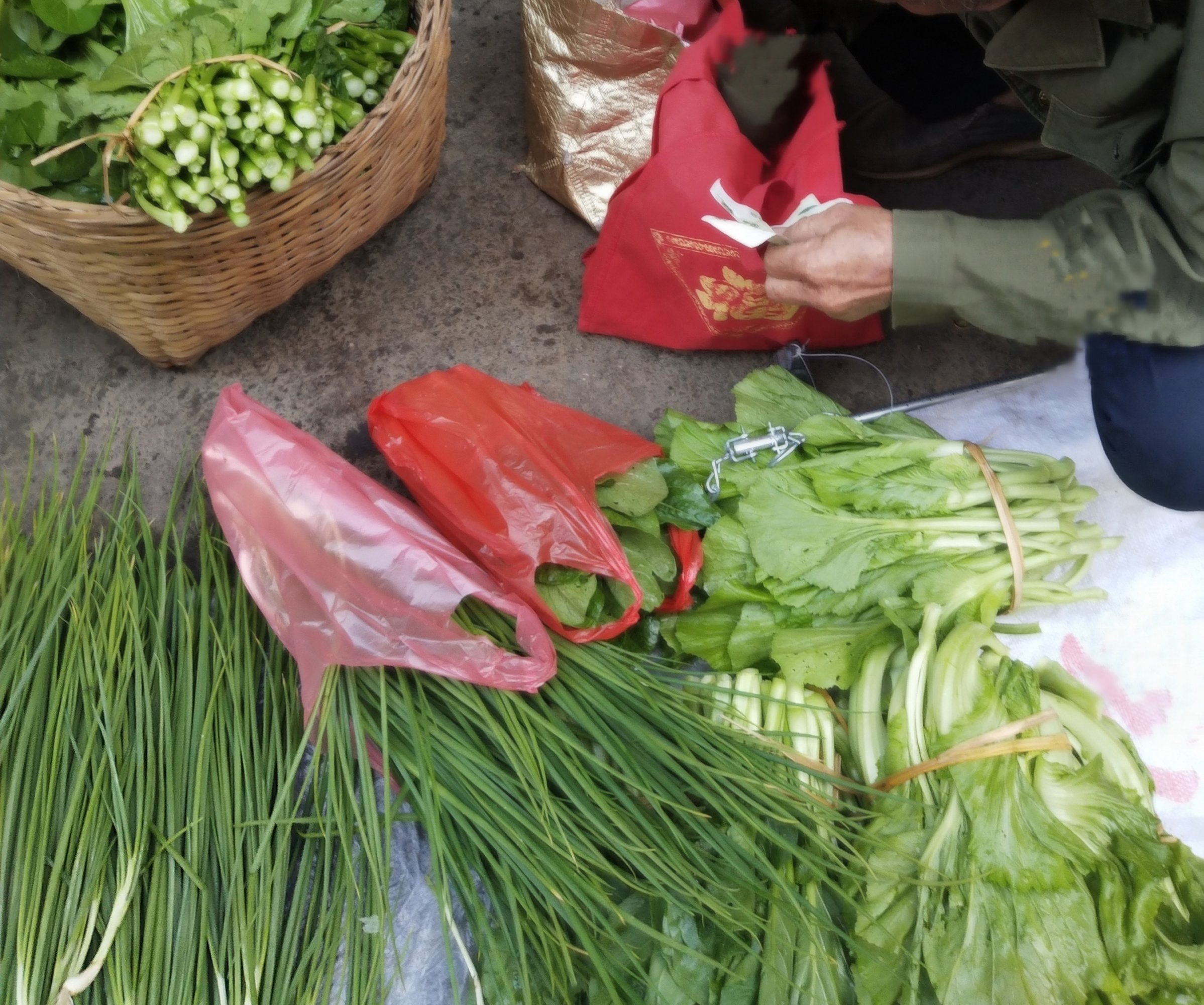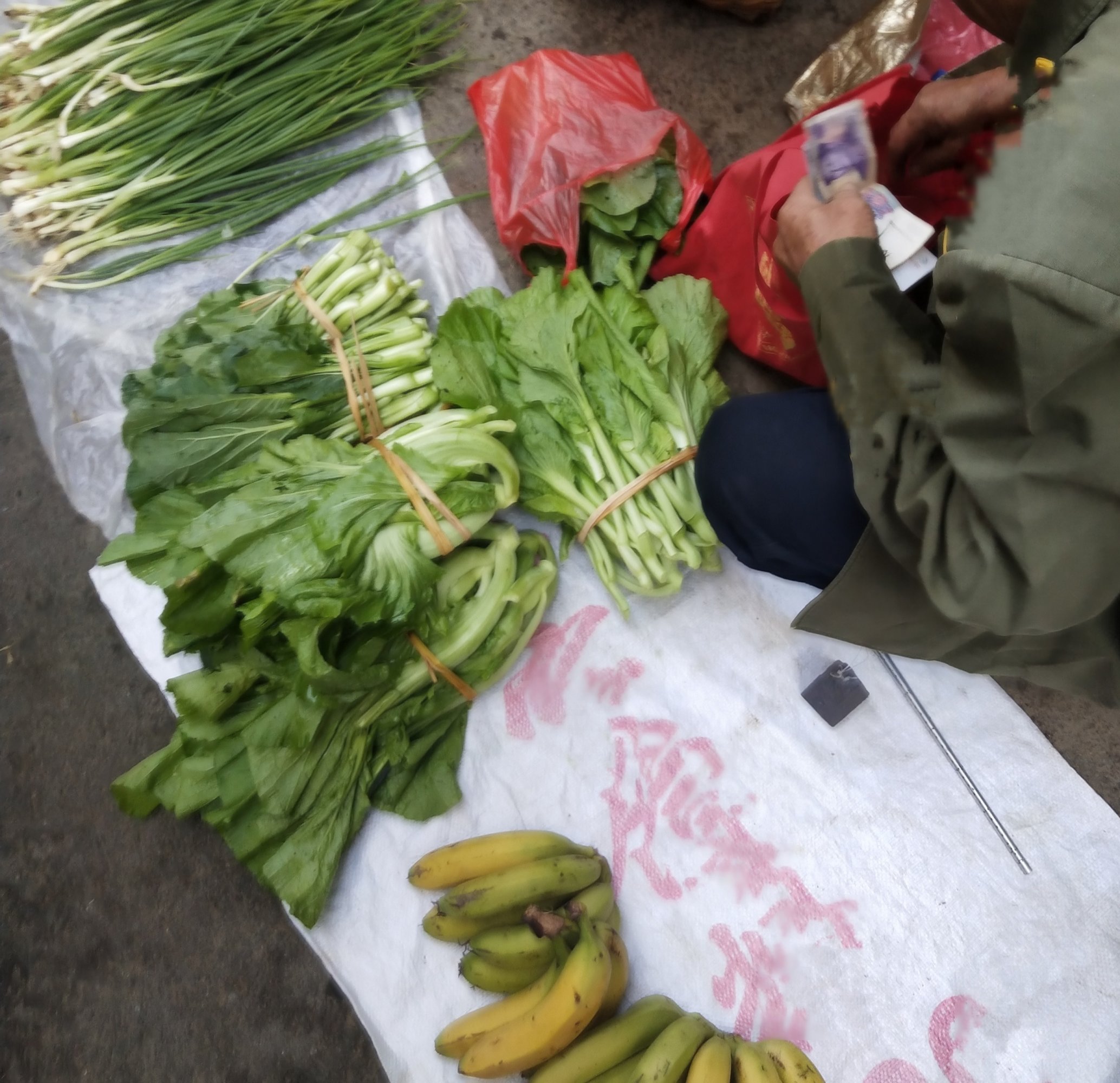 一天,去市场买点菜,在某市场闪角的外围,见一个老人家在地上卖菜,旁边也有半熟的香蕉,价格不算很贵,就帮衬好些白菜和葱,确定两种加起来的价格后,拿出手机微付,就问扫那?于是他就转身,翻找带来的袋子找微收卡片,过了一会,转回跟我说,有没有现金能不能付现金,我说你没有手机微信收付?于是他说有,不过那微信收款号是他孩子的,并接着说,他孩子怕他花钱如流水,不大给钱他、、于是又接着说,你给现金,我就给多几条葱给你,其实我平时也有带现金的,因一答一问也磨蹭不少时间,于是我说也好,就在裤袋钱包里拿出现金给他找、、、,后我也没多问,拿着菜与葱走了,反正家家有本难念的经,希望他能卖完所带来的菜葱香蕉,祝快乐安康!!