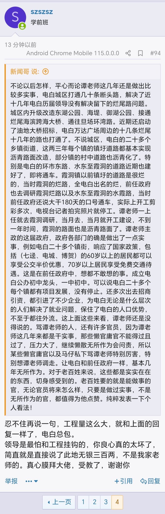 不论以后怎样,平心而论谭老师这几年还是做出比较多实事,电白城区打通几十条断头路,解决了近十几年电白历届领导没有解决留下的烂尾路问题。城区内升级改造东湖公园、海堤、御湖公园、接通烂尾海滨跨海大桥、通往旦场环湾路。近期还启动了油地大桥招标,电白万达广场周边的十几条烂尾十几年的路也打通了。不说城区,电白的二十多个乡镇街道,这两三年每个镇的镇圩道路都基本实现沥青路面改造,部分镇的村中道路也沥青化了。特别是电白的环市东路、水东至霞洞的道路近期也建好了,即将通车。霞洞镇以前镇圩的道路是很烂的,当时霞洞的烂路,全电白出名的烂,前任政府也去调研霞洞烂路以及水东至霞洞的水霞路,当时前任政府还说大干180天的口号通车,实际上开工剪彩多次,电视台记者拍完照片就停工。谭老师一上任就去霞洞调研,当月去,当月就开工建设,不到一年时间,霞洞的路面也是沥青路面了。谭老师主政的这届政府,政府各部门的确是做出了一点实事,例如电白二十多个镇街,响应了国家政策,包括(七迳、电城、博贺)的60岁以上的居民都可以享受公交半价优惠,70岁以上居民享受免费交通待遇。这是在前任政府中,想都不敢想的事。成立电白公办初中龙头,一中初中。可以说电白二十多个每个镇都有项目发展,没有停止。还多次出去招商引资,都引进了不少企业,为电白无论是什么层次的人们解决了就业问题,保住了电白的人口优势,不至于都往外流。这上面这些来看,谭老师还是没得说的。骂谭老师的人,还有许多官员,因为谭老师这几年来都是干实事,那些懒官庸官不能得过且过了,压力大了,继续懒散无所作为会问责,所以某些懒官庸官以及马仔私下骂谭老师特别厉害,特别想谭老师调走。让电白和前任政府一样,基本几年无所作为。对于老百姓来说,这些都是实实在在的东西,切身感受到的。老百姓要的就是能做事的官,无论官员将来怎么样,只要是做过实事,不是无所作为的官,都值得为他点赞。纯粹发表一下个人看法