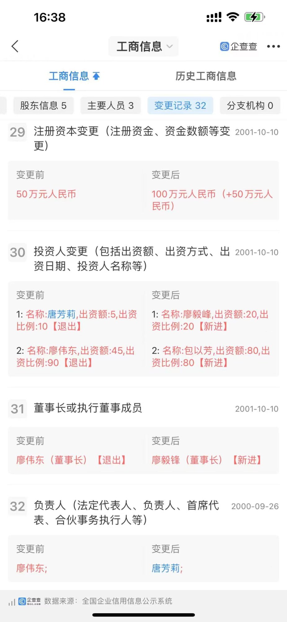 2001年10月10日,该公司“深圳市健康路贸易有限公司”注册资本从50万元增资为100万元人民币,股东变更为包以芳,出资额80万,出资比例80%,廖毅峰,出资额:20万,出资比例:20%。