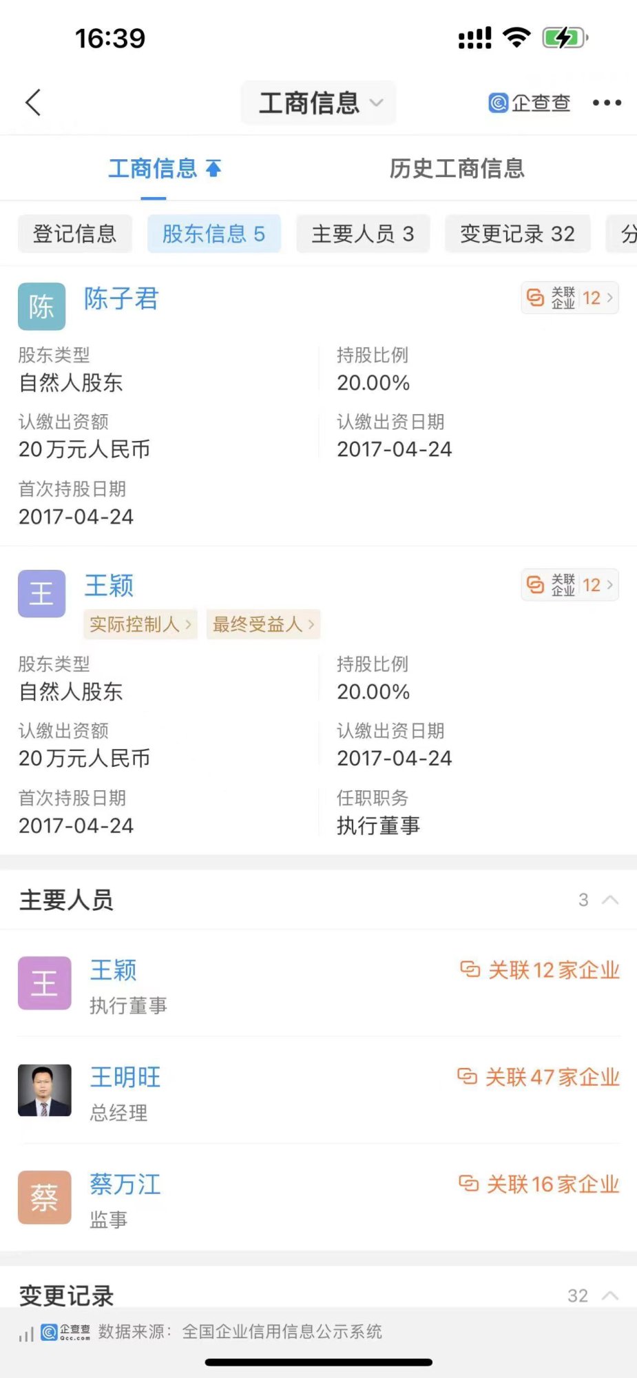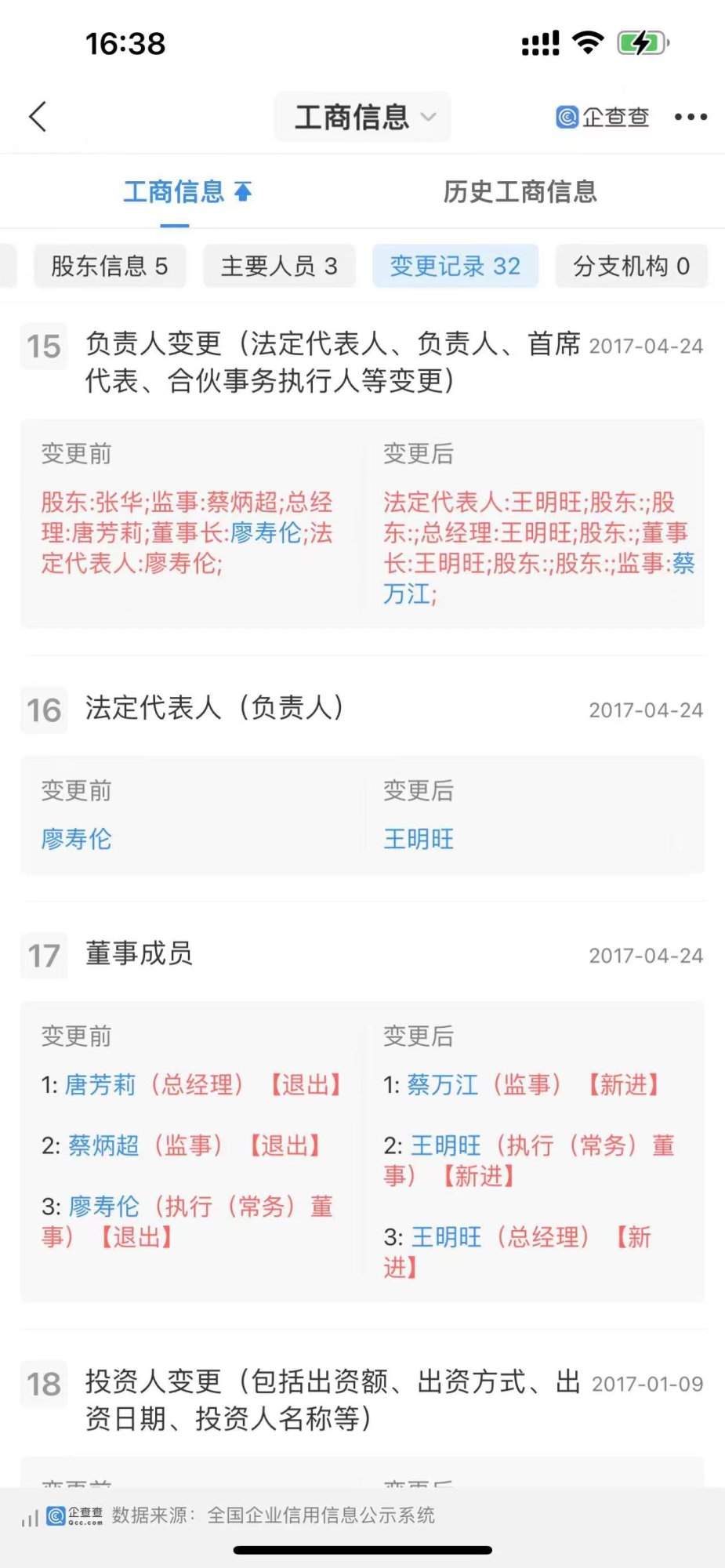 2017年4月24日,深圳市深电联实业有限公司”注册资本不变,公司的股东变更为:王明旺,出资额:20万,出资比例:20%,蔡万江,出资额:20万,出资比例:20%,肖奋,出资额:20万,出资比例:20%,王颖,出资额:20万,出资比例:20%,陈子君(陈校良儿子),出资额:20万,出资比例:20%。监事:蔡万江,法定代表人:王明旺。