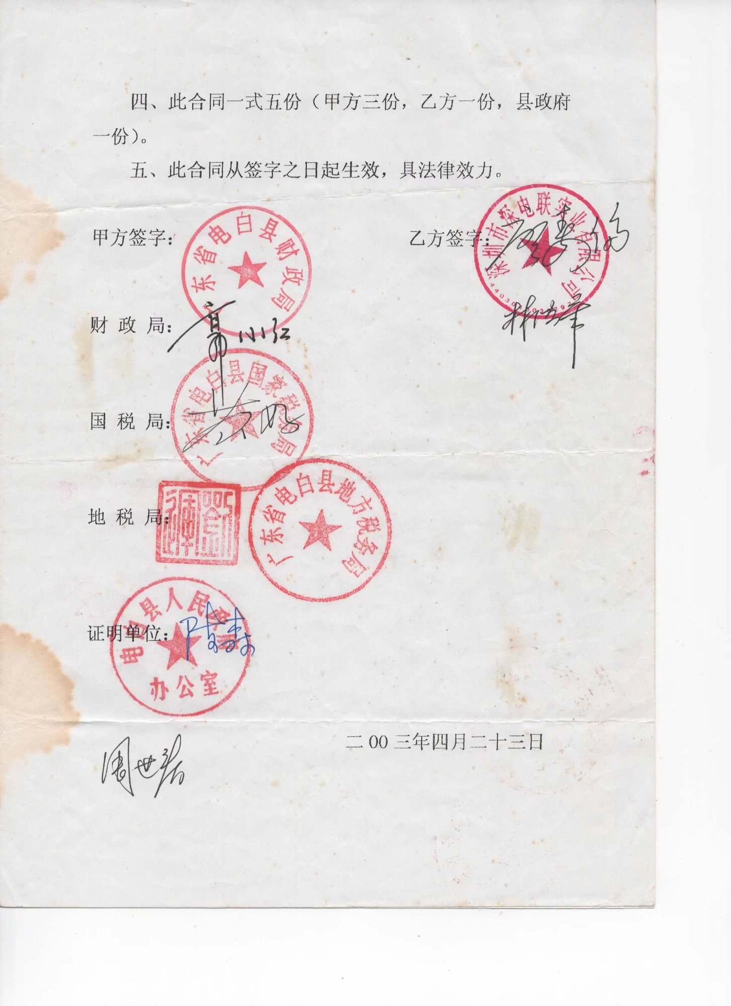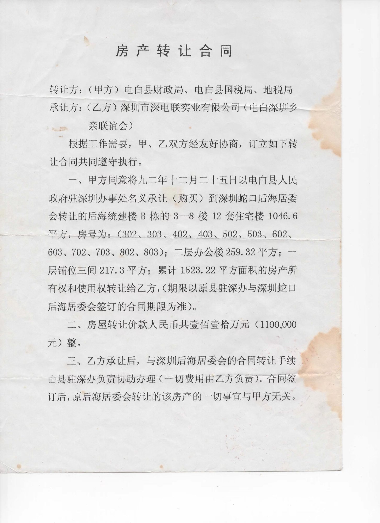 2002年,深圳电白乡亲联谊会廖寿伦会长多次与时任电白县委潘本书记和县委办陈森主任的沟通,得到潘本书记和陈森主任等领导的支持,把县财政局、税务局等政府机关在深圳设办事处时,与后海村委合资建设的12套住宅及办公室铺面共约1600平方米物业,最优惠卖给深圳电白乡亲联谊会,由联谊会发动深圳的电白乡贤捐款,共有67位乡亲捐款,总共捐款135.95万元,当时是以“深圳市深电联实业有限公司”与县政府的相关单位签合同,也是与后海村委会签过户合同,现在这些物业是落在“深圳市深电联实业有限公司”。