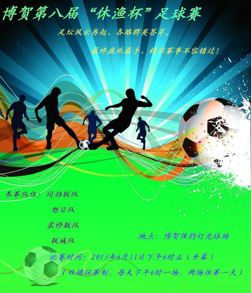 博 博贺水手 学前班 注册 2007-03-17 消息 49 反馈评分 0 点数 0 2013-06-09 #1 博贺第八届“休渔杯”足球赛,将于2013年6月11日起,在博贺保钓灯光球场举行,欢迎各路足球爱好者莅临指导交流。。。。 附件 海报.jpg 155.6 KB · 查看: 1,058