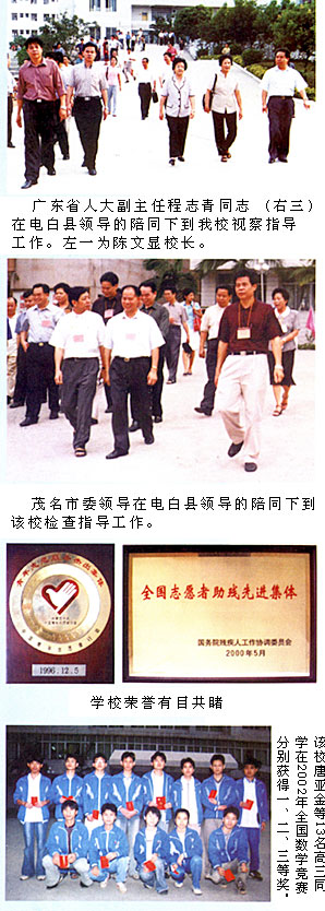 学校积极开创“四个一流”:师资一流、设备一流、管理一流、质量一流。现有专任教师193人,其中高级教师、研究生42人,一级教师93人。有全国先进教育工作者2人,“南粤教坛新秀”6人,广东省优秀班主任2人。2001年,3位教师代表茂名市参加省青年教师教学大赛,分别获得特别奖和二等奖。学校拥有比较完备、先进的信息化教学设备,标准的体育训练场。多年来,构建了“目标导向、系统管理、综合测评、整体推进”和“立足基础、培养能力、拓展思维、提高素质”的德育及教学模式,建立了分级分层管理的严密体系。办学以来,教育教学工作取得显著成绩:学校被评为“全国志愿助残先进集体”、市县文明单位,连续10年“事故为零”;学校“爱心社”被评为“全国青年志愿服务杰出单位”;学校团委被评为“广东省五四红旗团委”。高考上省线人数连续十年居县面上中学第一,1998年后跃居市面上中学前三名:中考成绩历年稳居县面上中学第一;参加县级以上学科竞赛,获奖达1726人次,其中获国际级奖励1人次,国家级奖励178人次,省级奖励351人次,市级奖励562人次。学校特别注重特长生的培养,充分发挥我校体育、艺术教师和教学设备、设施的优势,依靠科学的教学方法和严密的管理,每年为大学输送优秀的体育、艺术人才位于茂名市之最。