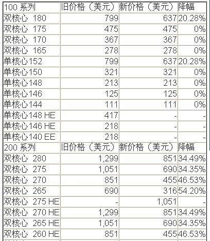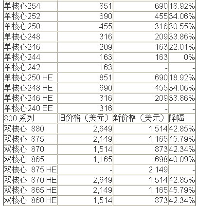 近日,AMD如期调低了定位服务器/工作站的Opteron(皓龙)处理器售价。其中,高端型号有超过1000美元(超过8000元人民币)的降幅,相当壮观。表格中售价皆为每千颗单颗价格。除了降价额度很大的超高端皓龙之外,Opteron 265降幅是最大的,竟达到54.20%,堪称明星,其最新价格仅为316美元。