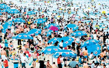 昨日,烈日炎炎。深圳东部大梅沙海滨浴场人头攒动,异常热闹,10万市民来到这里,在清凉海水里游泳消暑,远远望去,场面相当壮观。本报记者许光明摄