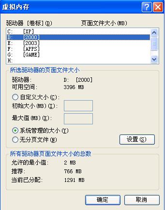 玩游戏时最好不要固定虚拟内存,最好改为由系统管理,固定虚拟内存在大场面时容易出问题。 查看下自己硬盘分区,看系统的可用容量够不够(建议至少2G以上),否可用容量过小可分页文件放到其他分区。 虚拟内存的设定: 控制面板――系统――高级――(性能)设置――高级――更改――高级――>