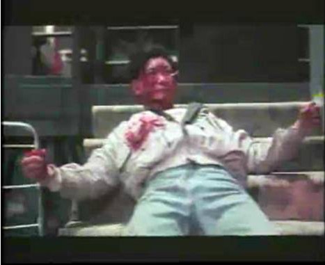 《江湖最后一个大佬》中饰演张仔,这次可是个好人,他与老板派来的那两个一男一女手下一场恶斗,最后被玻璃插死。