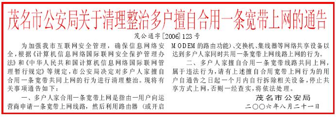 茂名市公安局关于清理整治多户擅自合用一条宽带上网的通告