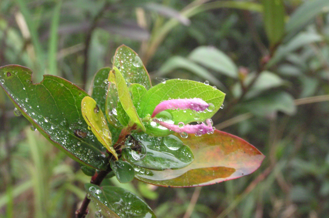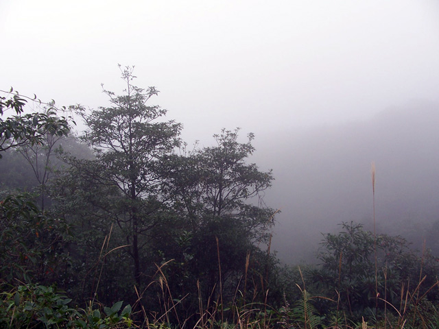 崎岖的山路不停向后退着,我们在林中穿行,一会儿站在此山,一会儿站在彼山,狂吸满带负离子的清新空气。时间在点滴流逝,天空也变得灰沉,周边的空气越来越湿润,雾气不断向我们袭来,将我们的眼睛模糊,将周边的景色掩褪,将风儿驱赶,将闷热积聚在我们的心胸,浓雾打湿了头发,空气似乎凝固了,身上发出的热气挥散不去,不多时大家已是大汗淋漓,雾水和汗水同时浸淫着我们的汗衣,沾乎乎难受极了,此时是多么希望有风儿掠过啊,哪怕是一丝丝也好。山路湿滑,不时有驴友发出惊呼,枯叶和泥土散发着阵阵腐味,似乎要令惊扰她好梦的人们窒息。终于见到一溪流,我狂喜,将双手浸入冰凉的溪水中,一阵凉意遍及全身,我掬一捧清泉洒抹在满是汗珠的脸上,那个快意是无法用文字所能表达的。