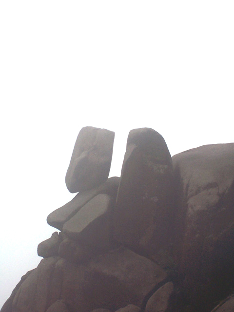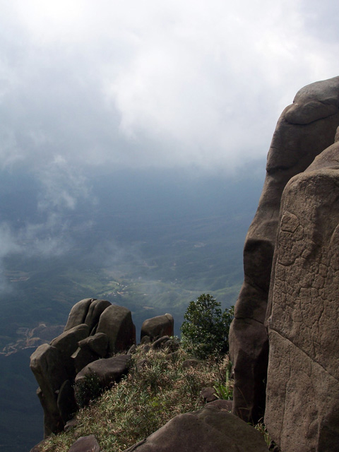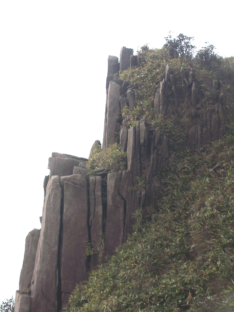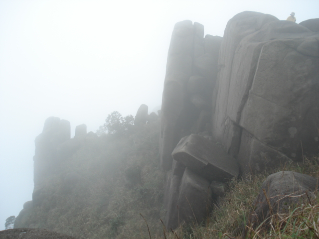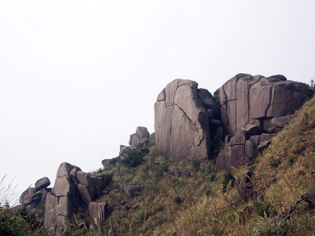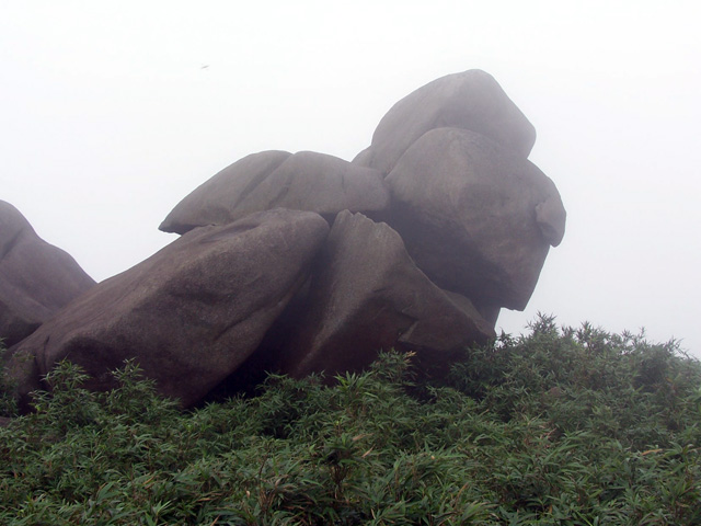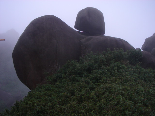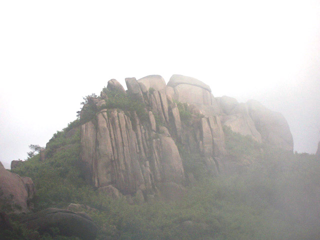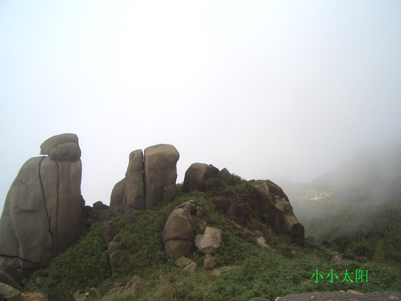 穿过山洞,登上峰顶,这里是防空洞顶部,水泥浆浇灌,使峰顶没有了天然本色,这是人类争斗的产物,这是历史的悲哀,这是人类的悲哀,这悲哀将远无尽头,噬食着世世代代老伯姓善良的心。此时,大雾重新积聚过来,将在峰顶休息的人们挤逼。阿翔独自坐在峰岩边上沉思,小小太阳在寻找理想的拍摄角度,飞龙小侠在摆弄心爱的DV机,一小驴在翻看随身携带的书本,一驴打开地席在躺睡,也有一圈烟民在吞云吐雾,享受登顶带来的快意,众多的驴们一边在腐败着带来的食物,一边在笑谈此行的收获。而我在驴们身边团团转,捕捉特别镜头。一派休闲景象。