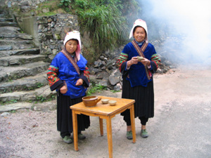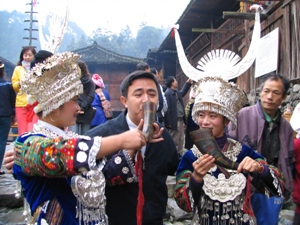 苗寨的拦路酒,一共有12道,是玉米高粱酒,不能用手去接,否则,一牛角酒你必须喝完。