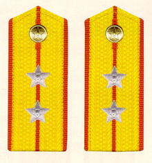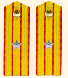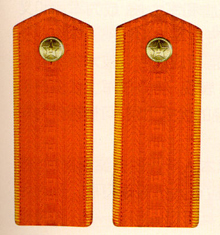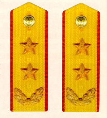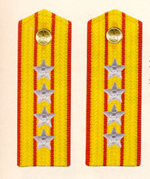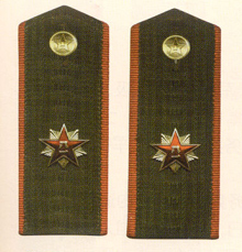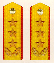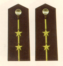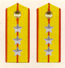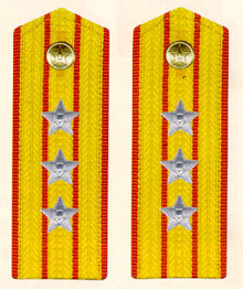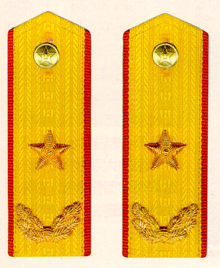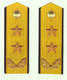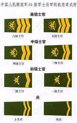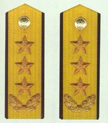 解放军陆军军衔――将官 (1):陆军上将为我军现行军衔制中陆军最高军衔、军衔条例规定,中央军委副主席、军委委员、总参谋长、总政治部主任一律授予陆军上 将军衔。陆军上将还是正大军区职军官的主要军衔。正大军区职包括副总参谋长、总政治部副主任、总后勤部部长、政委、大军区司令员 、政委等。注:黄的为肩章,绿的为软肩章