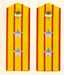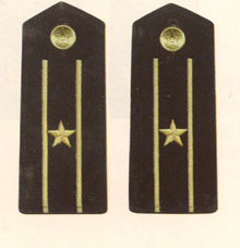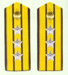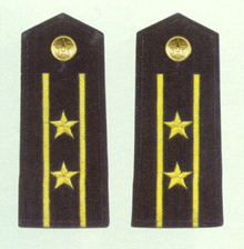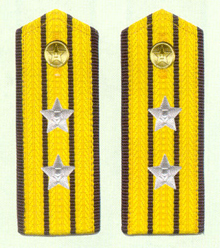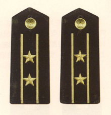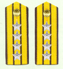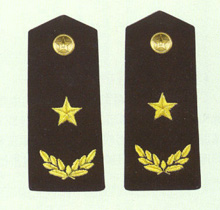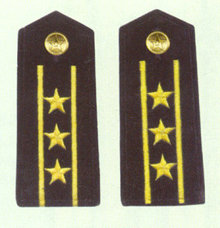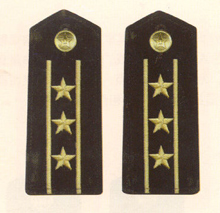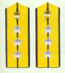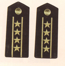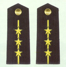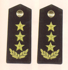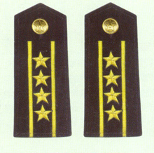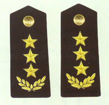 解放军海军军衔――将官 (1):海军上将为海军正大军区职军官的主要军衔,也是我军现行军衔制中海军最高军衔,一般只授予海军司令员、海军政治委员。其主要 标志为:金****肩章两佩镶有代表海军的黑色边饰,肩章底版上缀有仿刺绣金色枝叶和三颗金色星徽。