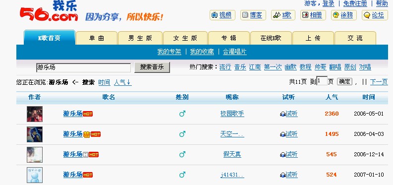 QUOTE(独孤小浪 @ 2007年05月05日 Saturday, 09:46 PM) 点击收听 56.com 人气排名第一的歌曲。 [snapback]1747290[/snapback] 56K歌网