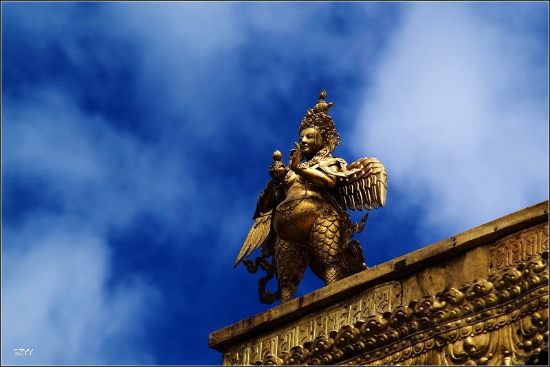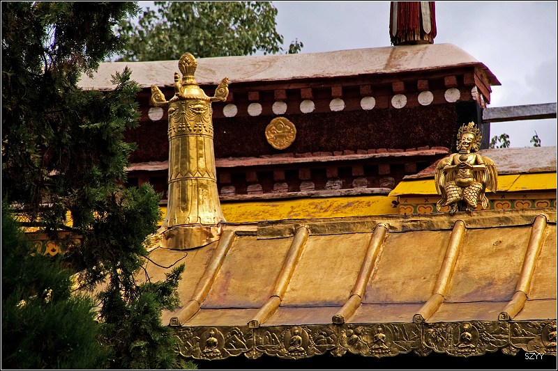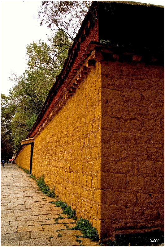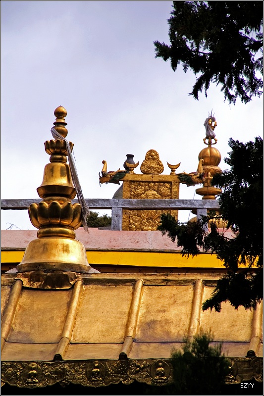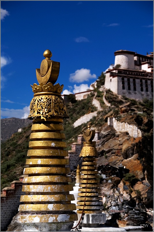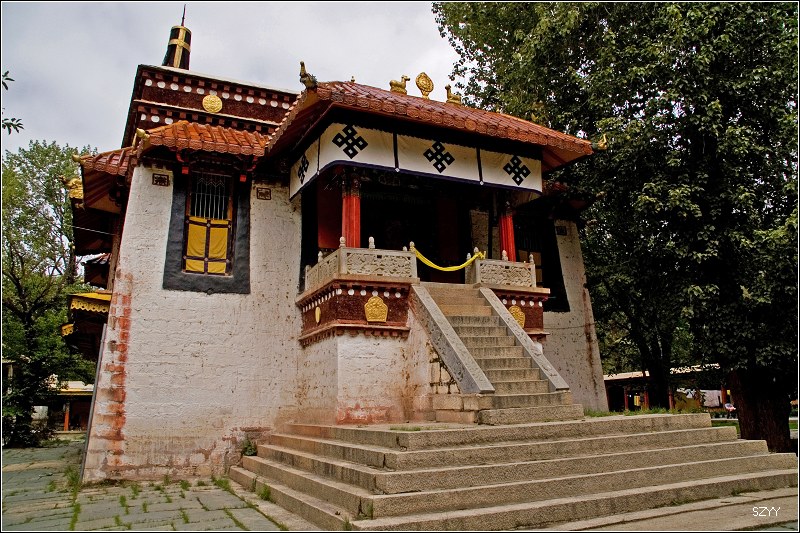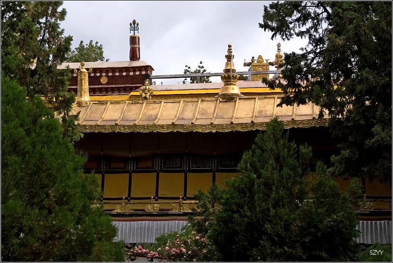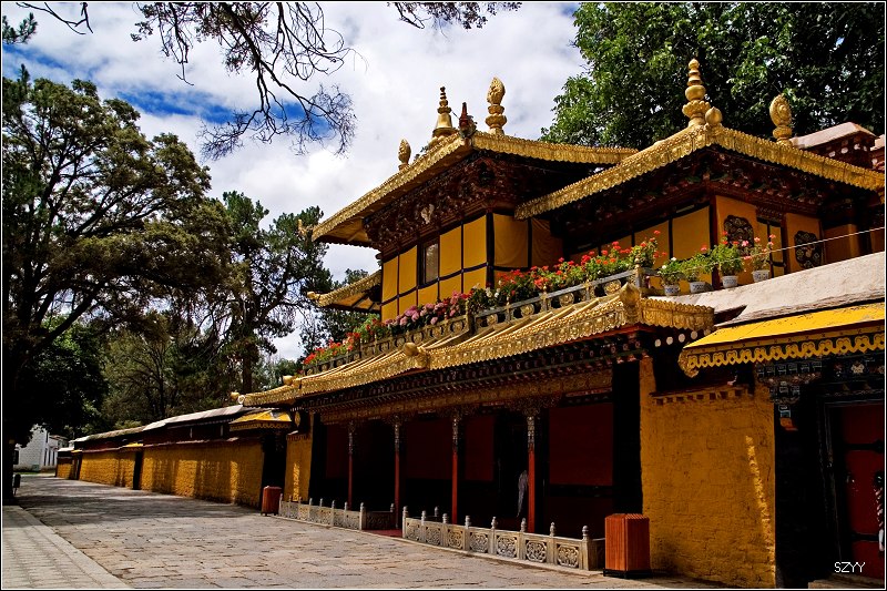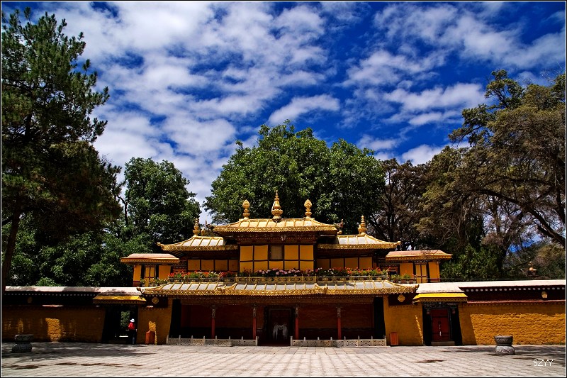 八世达赖在此基础上扩建了恰白康(阅览室)、康松司伦(威镇三界阁)、曲然(讲经院),把旧有的水塘开挖成湖,按汉式亭台楼阁的建筑风格,在湖心建了龙王庙和措吉颇章宫(湖心宫),两侧架设了石桥。