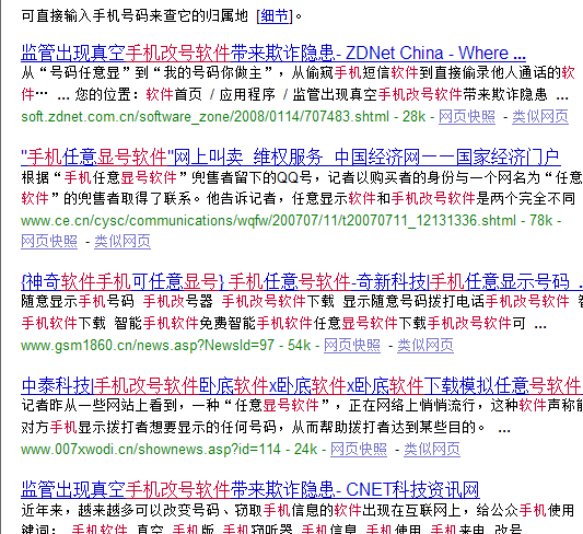 记者用搜索引擎在互联网上检索“号码任意显”后,立即看到数百条可以提供这一软件的网页。进入网页后,记者选择了一家名为“鼎新信息科技”的销售网站,网站服务人员明确表示,“号码任意显”的功能在于:在拨打有来电显示功能的手机或座机时,对方机器上将显示你事先设定好的号码。