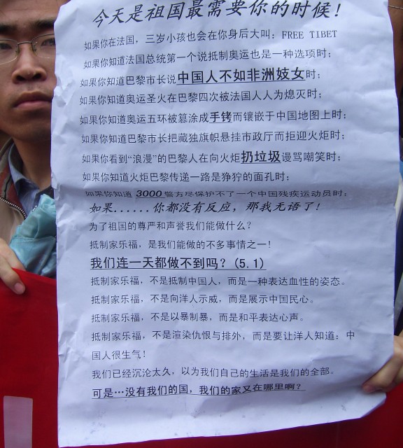 byronroy . 荣誉会员 注册 2005-08-17 消息 70,153 反馈评分 356 点数 191 2008-04-22 #15 家乐福恢复营业 客流比平日稍减 www.cnfol.com 2008年04月22日 08:20 文汇报 【本报驻安徽记者合肥21日电】此前受「抵制法国」事件影响的内地各家乐福,今日起已陆续恢复正常营业,惟客流量有所减少。记者在曾一度关门歇业的家乐福合肥长江店内看到,超市内一些购物市民正在选购物品,超市外用于隔离人群的大型工程车、大批警察和警车已全部驶离,周边交通等环境也已恢复平静。 在广场一楼大厅的一面墙上,家乐福张贴出《致广大顾客书》,落款时期为4月19日。文中表示,家乐福「从来没有支持过任何非法组织、始终积极支持北京2008年奥运会」等,引起不少人驻足观看(见图)。 官方网站处「维护」状态 而家乐福官方网站原本的促销信息、大幅海报都已不见,取而代之的是中英文的声明,内容为「尊敬的家乐福客户们,谢谢您们过去这段时间对家乐福网站的支持,为了提供更好的服务,所以家乐福内部正在进行网站的维护与更新」。