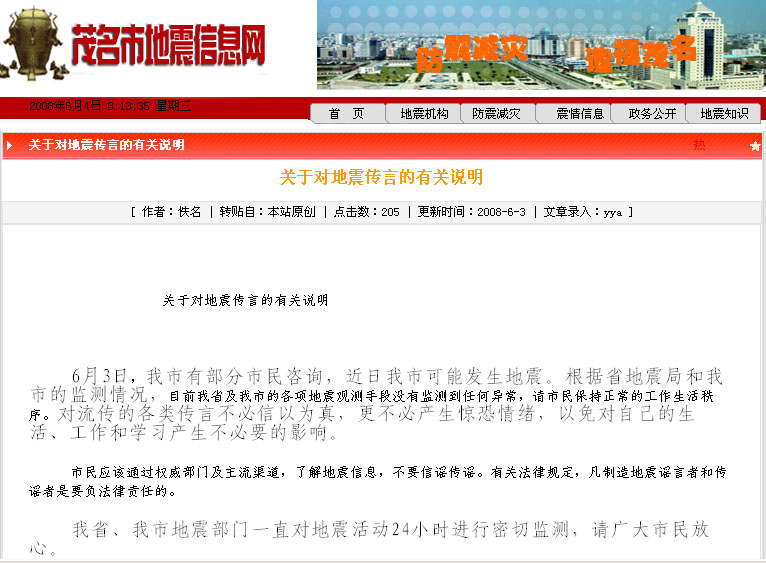寒 寒楼木子 幼儿园 注册 2006-10-30 消息 17 反馈评分 0 点数 0 2008-06-04 #2 茂名市地震局的官方网站:http://dzj.maoming.gov.cn/index.asp