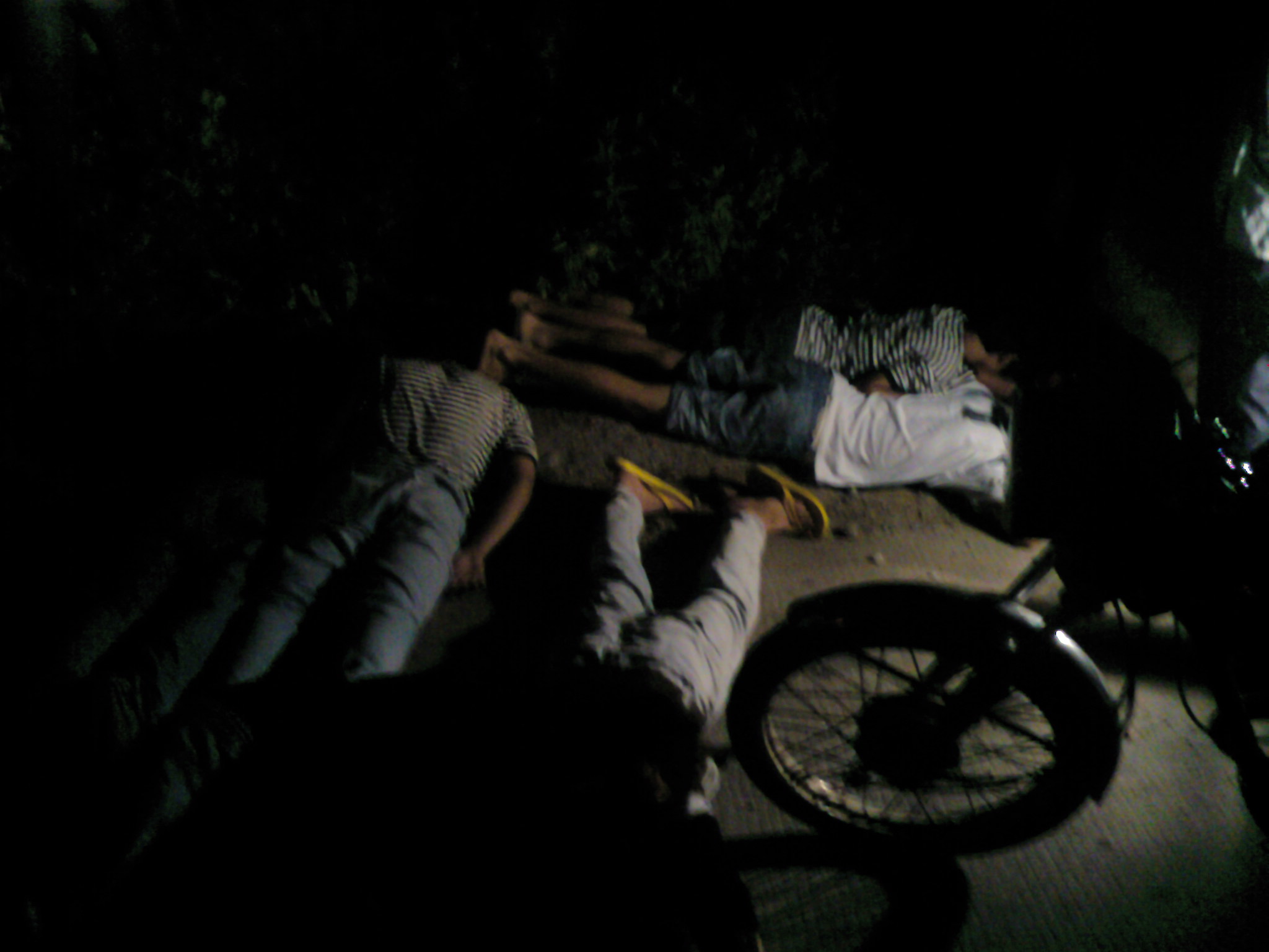 昨晚半夜一点多钟在水东喝完酒骑摩托车回家,来到陈村戒毒所路口时发现路上停了好几部摩托车,有几个人用几支手枪顶着几个男青年趴在地上,吓我一跳,开始我以为是抢劫,原来是陈村派出所的公安抓了六个抢劫犯正捆绑在地上,缴获了几把开山刀,一个公安在附近的草丛里寻找着什么,陈村派出所的公安真厉害,四个人抓了六个人,要不是他们抓了这帮人渣,可能被抢的就是我了,这等新闻怎么能错过,我连忙用手机拍了下来跟大家分享。