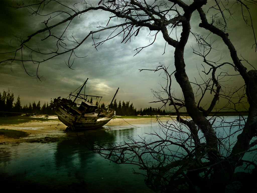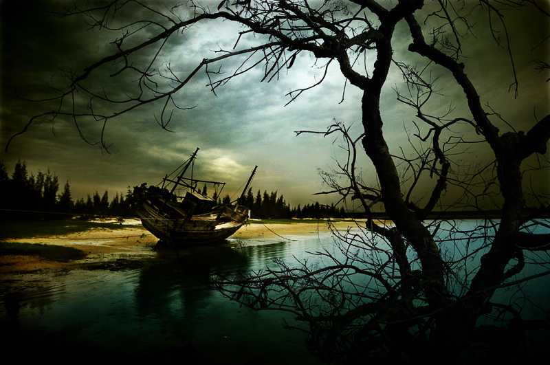 阴雨、枯树、长满寄生贝类的旧船共同营造出画面神秘意境.