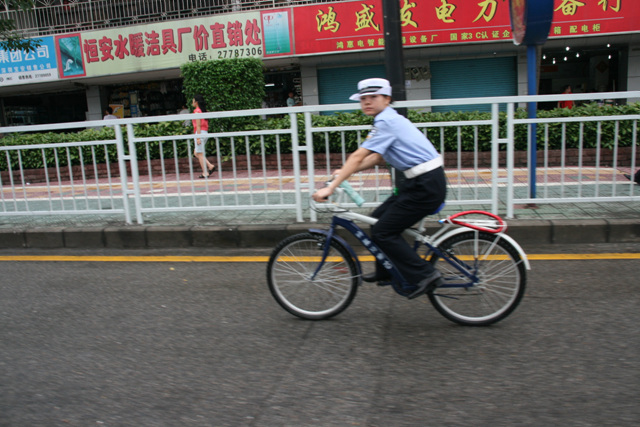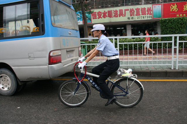 深圳宝安骑单车的女巡警,骑着单车走进了机动车道。