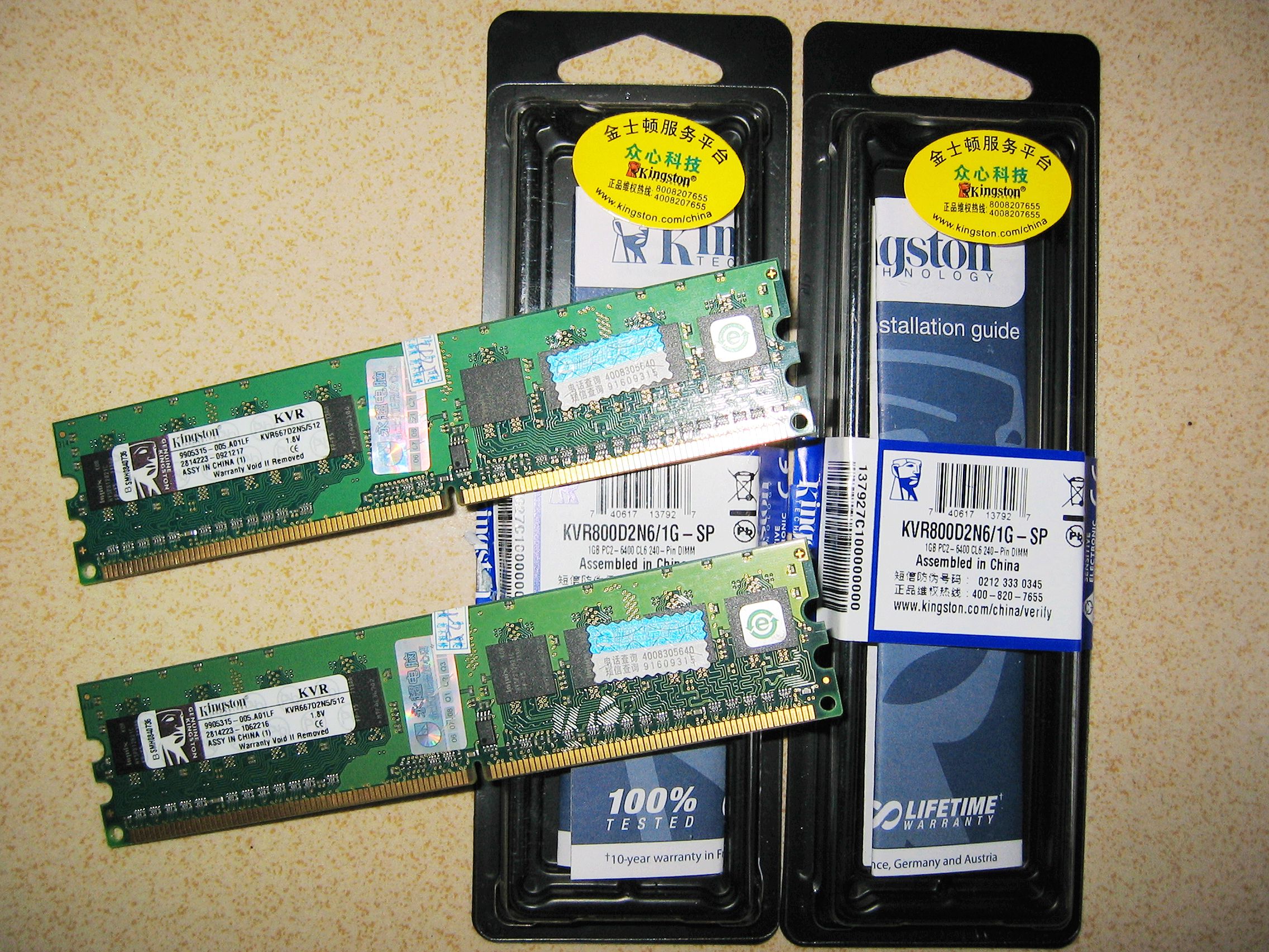 2007年4月25号购入! 还在保修期内,性能良好! 升级了拆出来的。 型号KVR667D2N5/512 大板PCB 金士顿DDR2-667/512MB *2条 建议组成双通道。 两条60元(限水东出)。 QQ:523302655 13926739328