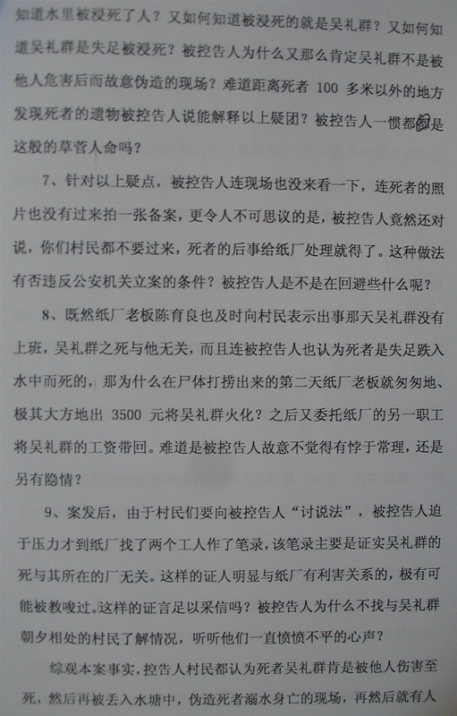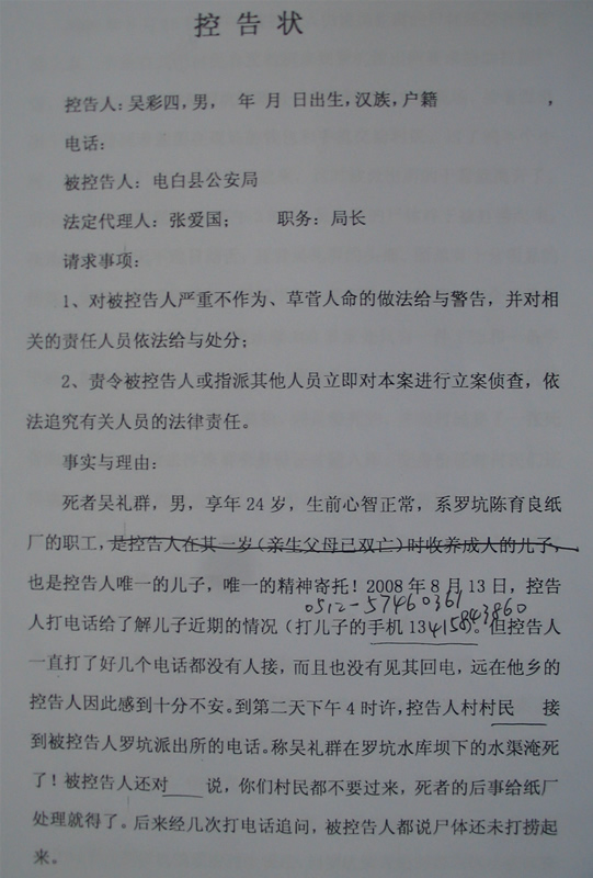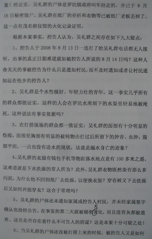 死者吴礼群,男,现年24岁,其出身贫寒,在年仅1岁时父母离异,由父亲吴彩四历尽艰辛带大成人,生前是电白县罗坑镇陈育良纸厂的雇佣工人。在2008年8月13日,吴彩四多次给儿子吴礼群打电话没有接听,8月14日下午4时左右,我村村民接到电白县公安局罗坑派出所电话,称吴礼群在电白县罗坑水库淹死了,有身份证证实,但尸体尚未打捞起来。8月15日上午,我村9名村民赶到罗坑派出所要求协助打捞尸体,中午12时许,罗坑派出所干警和罗坑镇政府干部带我们村民来到现场,经现场所见,在离水域100多米处有吴礼群的一件T恤和一条牛仔裤,均伴有泥巴,衣服里有一新一旧两张身份证、一个钱包、两张银行卡、一台手机和一条钥匙,罗坑派出所干警在把衣服里的上述物品交给我们村民后约半个小时就离开了。打捞工作进行至下午3时许,吴礼群的尸体终于被打捞起来,只见吴礼群的尸身穿着一条裤丫,头部有受伤的痕迹,面部损伤明显,头部至胸部呈紫色,腹部平坦没有吸水的现象。我们村民当即要求给尸体拍个照片,遭到罗坑镇政府参加打捞人员的拒绝,接着,他们向我们村民要了一张死者吴礼群的旧身份证,说是为冰冻保存尸体入库使用,之后,我们村民向罗坑镇政府干部和罗坑派出所干警明确提出:必须待查明死因以及由吴礼群父亲吴彩四从江苏回来见他最后一面之后再火化。2008年8月19日下午,死者家属及我们村民来到罗坑派出所了解情况,却被告知本案不属于派出所受理的范围,叫我们直接去找纸厂老板处理,我们打电话给纸厂老板陈育良,陈育良说案已经结了,他已交3500元给罗坑镇殡改办(即社会事务办公室)的同志并在2008年8月16日下午就把吴礼群的尸体拉去进行了火化。如此般的胡作非为,简直是到了无法无天的地步。不但令死者亲属痛不欲生,更令我们义愤填膺!