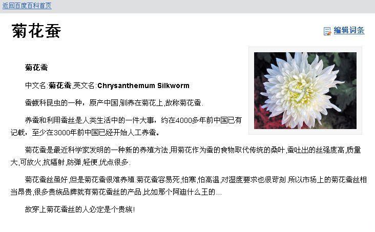 菊花蚕是最近科学家发明的一种新的养殖方法,用菊花作为蚕的食物取代传统的桑叶,蚕吐出的丝强度高,质量大,可放火,抗辐射,防弹,轻便,优点很多.