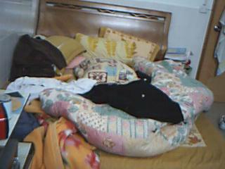 QUOTE(..}菟」 @ 2005年03月13日 Sunday, 01:05 AM) 这样要怎么睡觉呢"? [snapback]268941[/snapback] 不是哦,我刚在外地回来...回来前家人已经打扫过了 没几天又变成这样了,没以前那么乱了...... 睡觉叫这么睡上去咯,拿张被随便盖就行了...