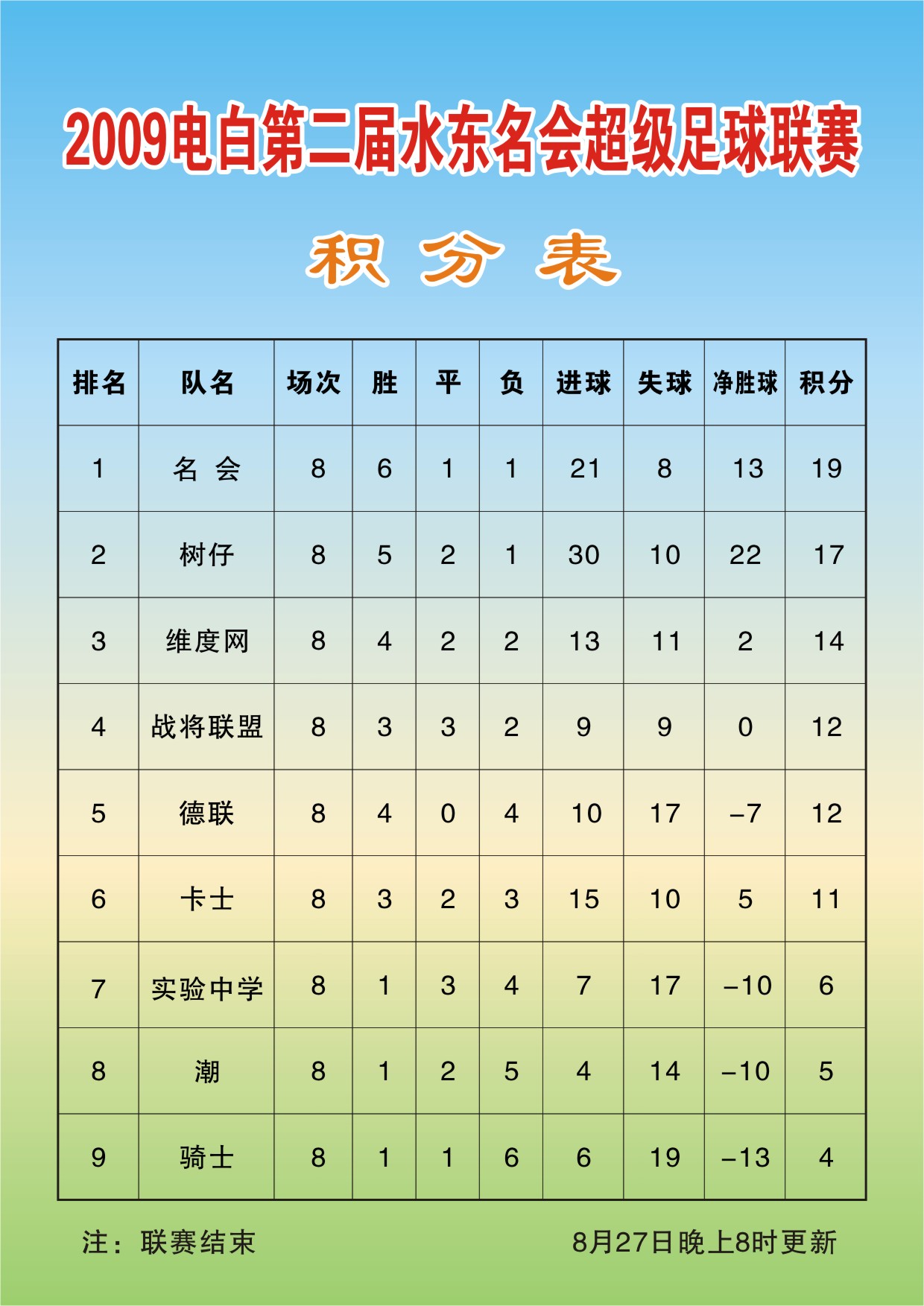 华 华龙快印 初中三年级 注册 2008-02-04 消息 502 反馈评分 0 点数 1 2009-08-27 #76 今天下午赛果: 树仔 8:0 德联 名会 2:0 战将联盟 2009电白第二届水东名会超级足球联赛圆满结束,祝贺名会俱乐部取得冠军! 明年水超见! [attachmentid=222113] 附件 积分表.jpg 287.6 KB · 查看: 577