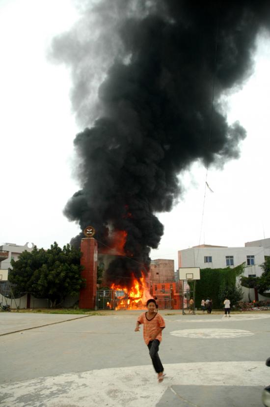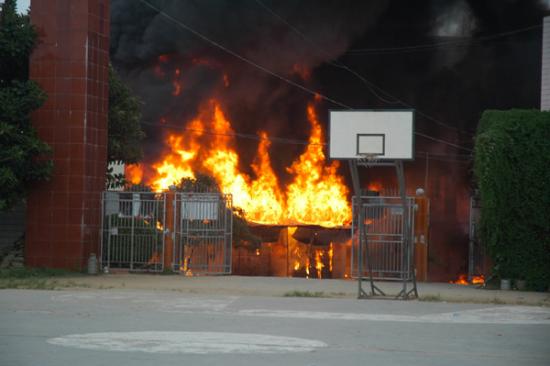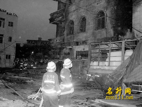 记者昨晚7:30赶到现场时,大火已被消防官兵扑灭。发生事故的民居位于大衙中心小学大门口正对面,是一栋三层高的楼房,已被烧得面目全非,四面都是黑糊糊的。一楼面对大衙中心小学的铁门被烧炸得严重变形。朝南的正门前,有一辆烧得只剩下一个油罐的小型油罐车。据目击群众说,当时,此车正在往屋内卸油,不知是什么原因引起火灾。在它南门口前20和50米远的街上,记者还见到两个被烧已扭曲成一团的汽油桶,在旁边围观的群众说,这是爆炸后从屋里飞出来的。