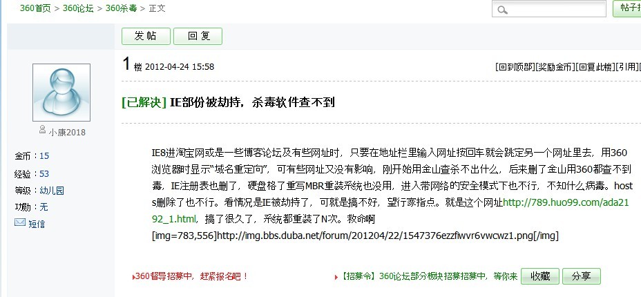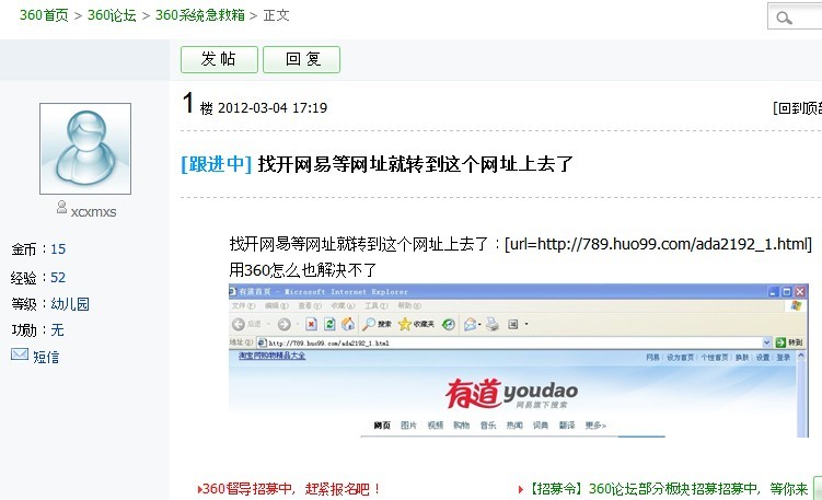今天晚上突然之间无端端的电脑失常,打开QQ空间、百度、淘宝、网易、拍拍等多个网站都自动跳转到http://789.huo99.com/ada2192_1.html这个网站,害得我以为是电脑中毒了,瞎搞了几个小时,什么恢复、重装IE、杀毒、删除插件几次,问题依然不能解决,后来能打开百度后,一搜索,发现还有很多人都出现这样的问题,而且重装了好几次系统都不能解决问题,后来才知道运营商搞的好事。(不信大家可以去百度搜索一下,搜那个网站就行了)