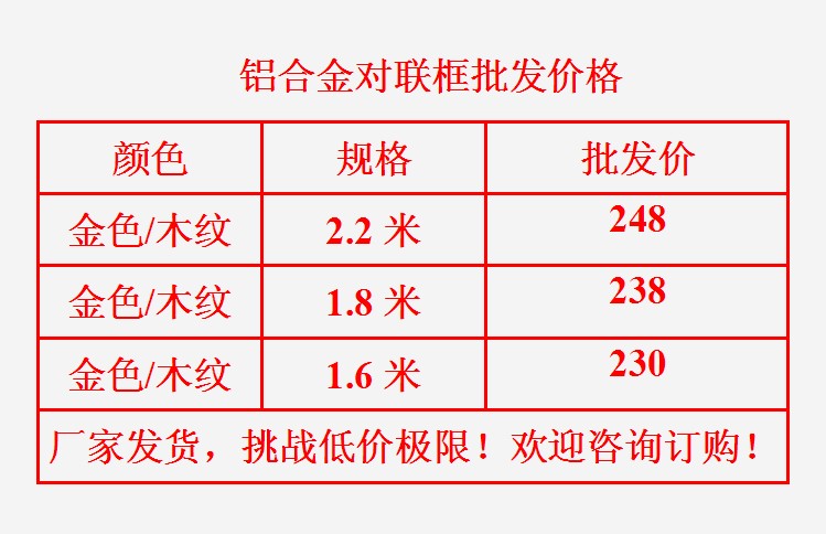 新年渐近,进宅、结婚较多,很多人都订做对联框,张显喜庆气氛!本店应大家要求,特别推出全新铝合金对联框。有各种规格:2米2、一米8、一米6、一米4,还可以按要求定做。本店所使用的是加厚的铝合金材料,绝非市面上的薄料,可现场对比;使用铝塑板作为垫板,不是三合板(遇水或潮湿天会发霉腐烂),铝塑板就可以防水,还可以防止发霉,对联框的质量绝对是目前市面上最好的!欢迎各位前来咨询、批发、订购。优惠多多!地址:水东镇桥南路,电话:14718109620,QQ:1259604111,联系人:阿华