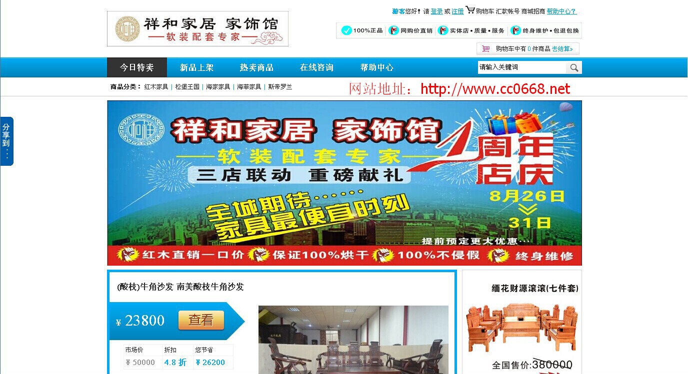 店庆期间网购可享受以下优惠: 1、实体店下单前,登陆祥和家居优惠在线网站订购可以优惠500元―10000元。 2、在网站订购可以享受积分兑换礼品,有红木筷子380积分、智能电饭煲980积分、高端海马床垫3800积分。 3、为了答谢新老客户,店庆期间每天下午随机抽取三名幸运儿,将获得精美礼品一份。 [attachmentid=331583]