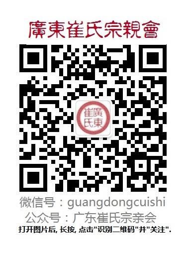 值电白崔氏2015年重修族谱,现开通微信公众号平台,希望可以把崔氏历史文化以及最新的消息、新闻传播到每位崔氏子孙手上。请用微信扫一扫二维码关注公众号,或者搜guangdongcuishi或“广东崔氏宗亲会”来关注。最新的崔氏资讯等着你!