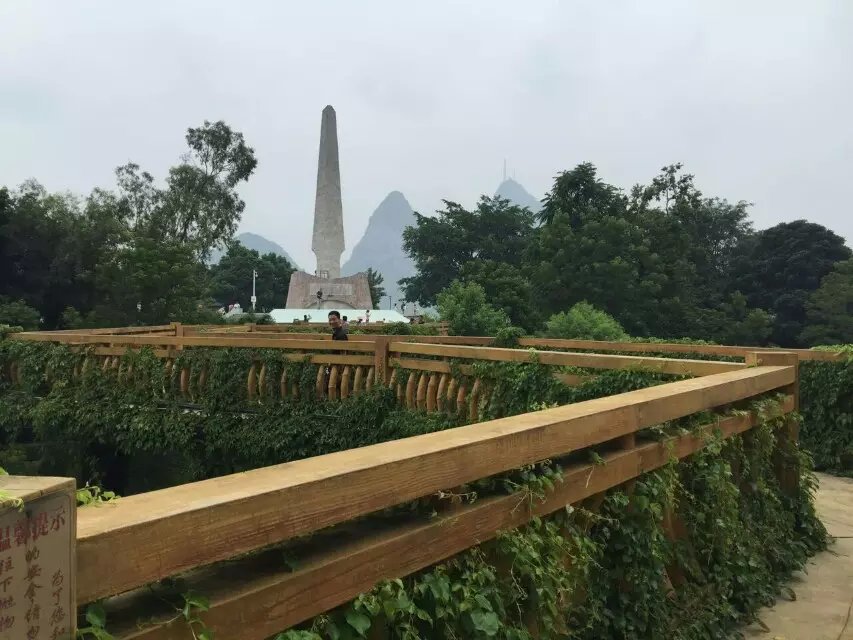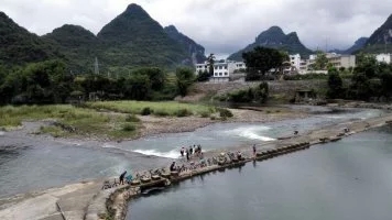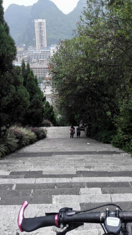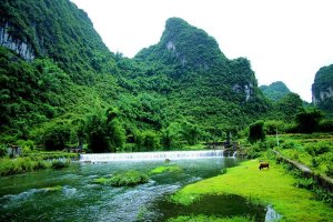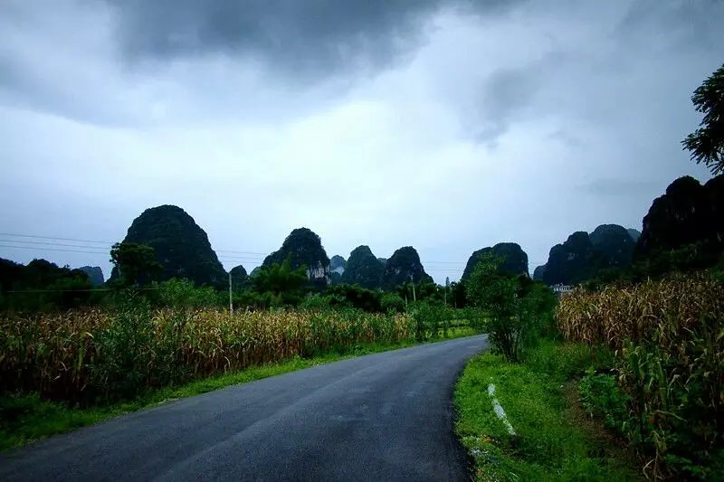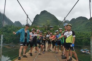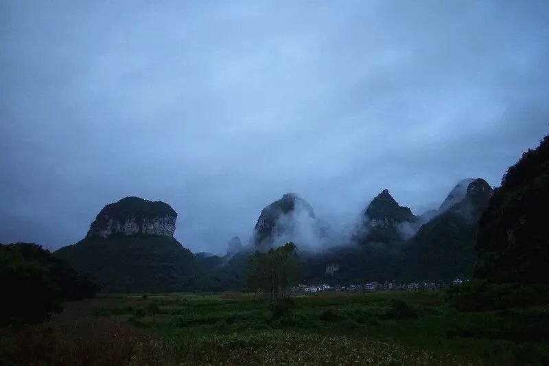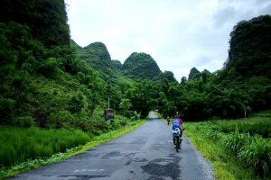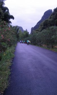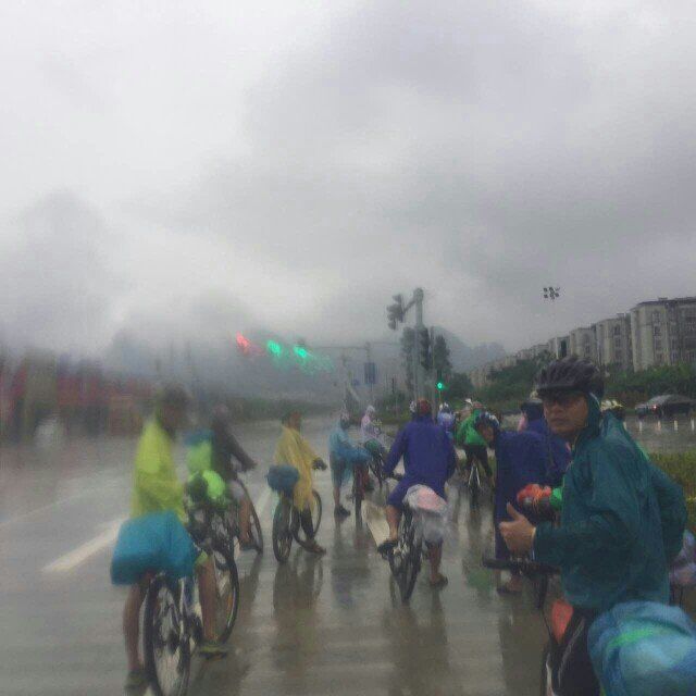 宜州第一天行程安排: 宜州~刘三姐乡~祥贝乡~天河镇~怀群镇,骑行80km.途经刘三姐故里、国家地质公园、天门山景区,宿罗城怀群镇.今早8时半,水东湾骑行队员刚到达广西宜州,一下火车,大雨倾盆,地面湿滑,但久经战阵的全天候骑士情绪并不受影响,有条不紊地装车、驭包、披雨衣、吃早餐。9时半出发,目标天门景区。透过朦胧的雨水,远山只看到轮廊,但潮湿的空气更令人神清气爽,惬意怡人。据介绍宜州(河池)临江河风景区北起祥贝乡拉托村畔,南至三江河口与龙江河交汇,河道全长37公里,含下枧、古龙、祥贝三个河段,我们经过的刘三姐故居的地段就在下枧河段。中午,老天爷似乎被感动,慢慢露出了斑驳的阳光,沿岸河水碧绿,山水交融,被轻纱般的白云飘过的群山更显叠翠。比较桂林山水,一个名声在外,一个尚待闺中;一个浓妆重彩,一个青涩娇羞;一个成熟迷人,一个清新优雅。
