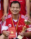 点评:本次比赛中进球两个,特别是决赛中打进追平一球将球队带进了点球大战,中场灵魂,进攻及进球主要组织者。说到郭靖,不能不说电白足球的历史,郭靖于初中时代就开始组织电白足球的比赛,至今已经有十八个年头,其所组织的比赛从开始的四支球队到高峰期的十二支球队,从“玩泥沙”式的到今天的有组委会、裁判组的正规化,贺岁杯、七人赛、三人赛,学生杯、水超等本地比赛,及带领电白足球后生一代到吴川、湛江、高州、茂名、化州,广州、珠海、深圳拉练,为电白足球爱好者提供了平台、机会去提高水平。茂名东方新世纪亚军、茂名市第11届运动会足球赛亚军,就是电白足球水平提高后的成果。十八个年头,多少汗水、泪水,多少挫折和困难都阻碍不了郭靖为提高电白足球水平的决心,所以英雄谱他应该排第一位。