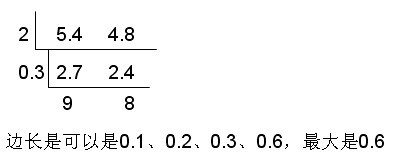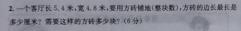 本题是五年级的最大公因数问题与正、长方形面积题 5.4米=54分米,54的因数分解=1*54=2*27=3*18=6*9 4.8米=48分米,48的因数分解=1*48=2*24=3*16=4*12=6*8 54与48的公因数有:1、2、3、6 显然方砖的最长是6分米, 利用长方形面积/正方形面积得块数:(54*48)/(6*6)=72(块) 或利用长、宽的格数求块数:(54/6)*(48/6)=72(块)[/COLOR]