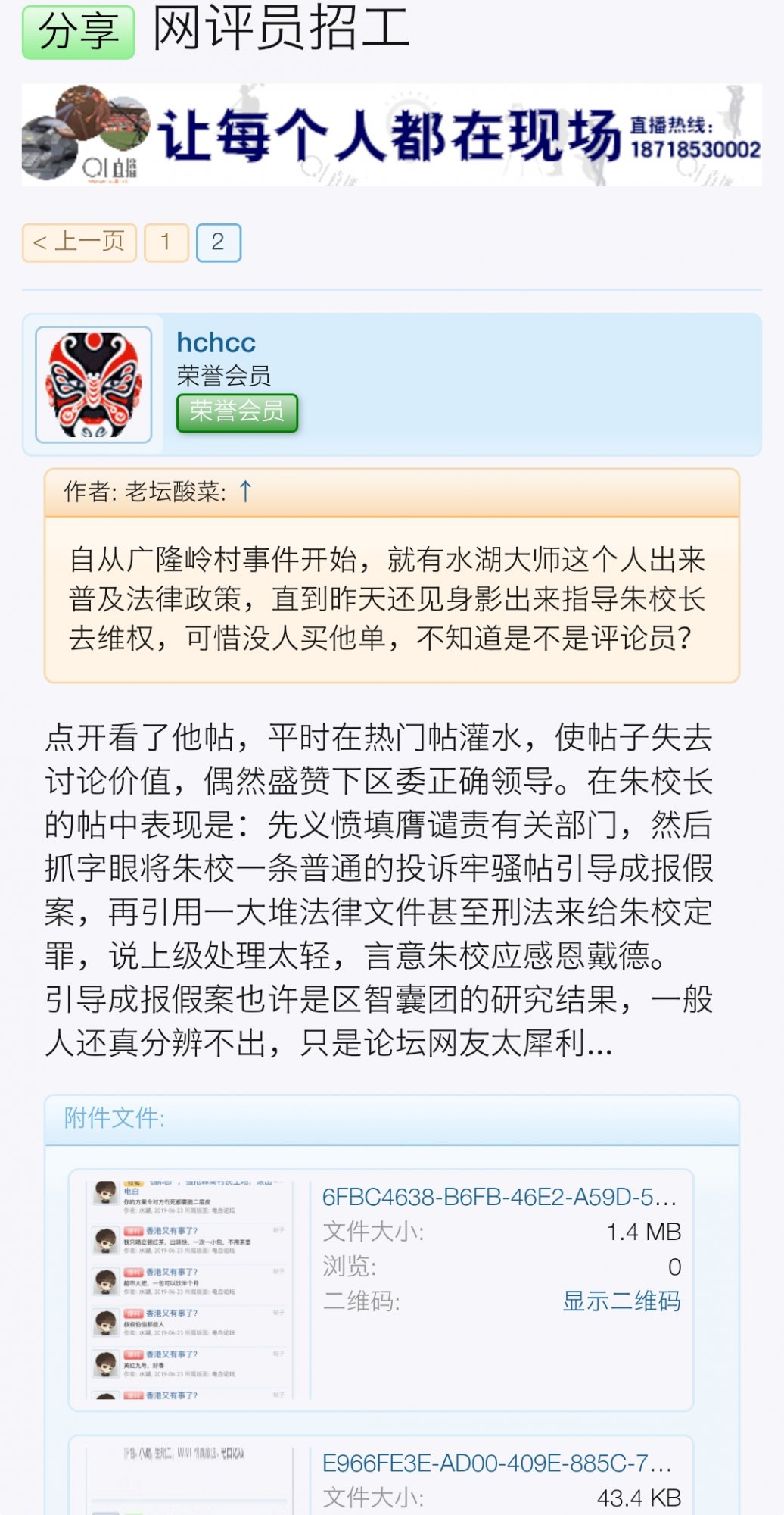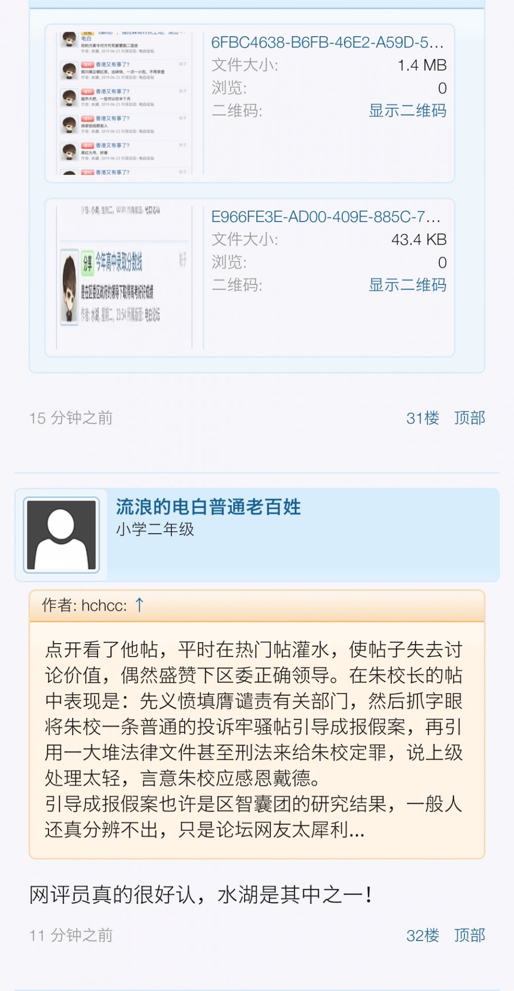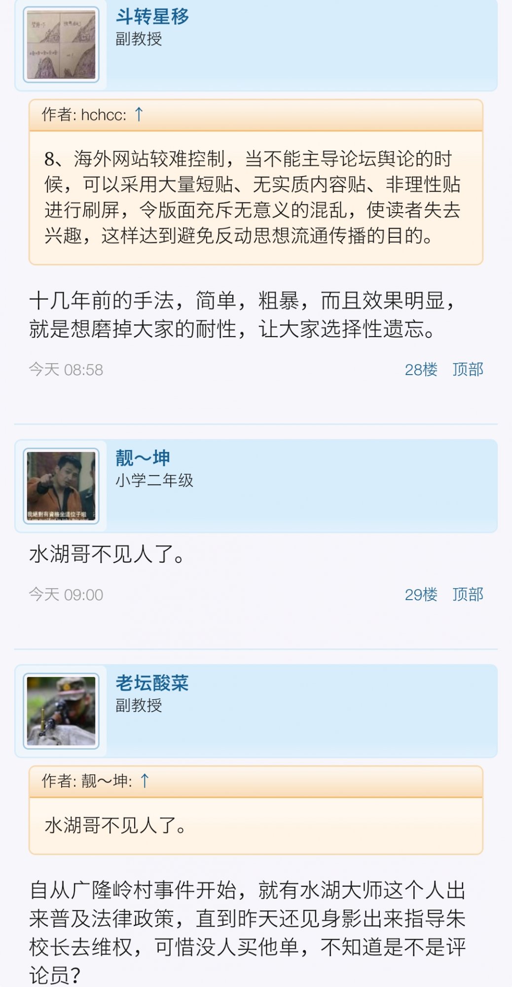 回顾网友们的评论和综合意见,发现 @水湖 这个人原来是宣传部舆情网络评论员,这些人专门潜伏在论坛恶意扭曲舆论导向搞破坏,而这个ID应该是因蓝田坡小学朱校长事件已被论坛管理员封禁了。以前我就觉得这人说话古怪,一直在广隆岭村土地维权贴中肆意对我村挑拨离间,并引用法律规章进行嘲笑恐吓本村人,原来这一切都是区政府的阴谋。可能本帖中还潜伏着很多网络评论员,真是细思极恐。